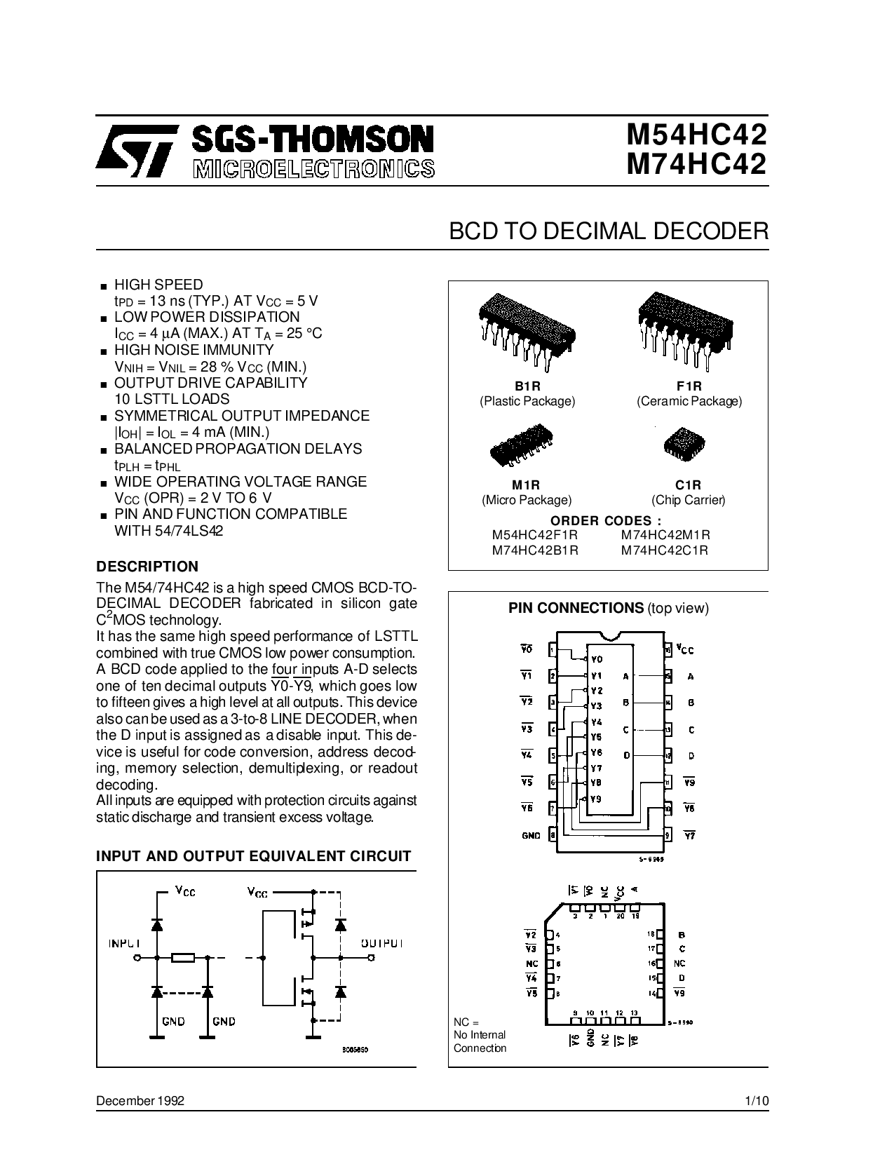这 m54/74hc42 是 一个 高 速度 CMOS bcd-至-