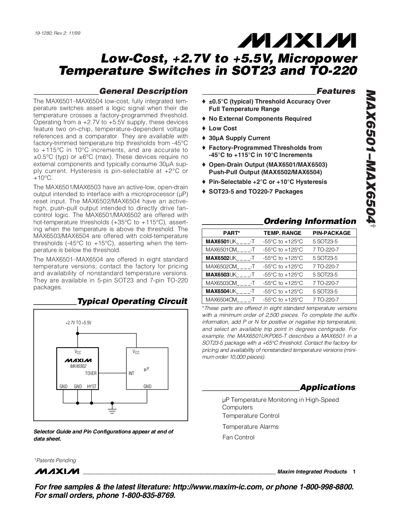 Low-Cost, +2.7V to +5.5V, Micropower Temperature Switches in SOT23 and TO-220