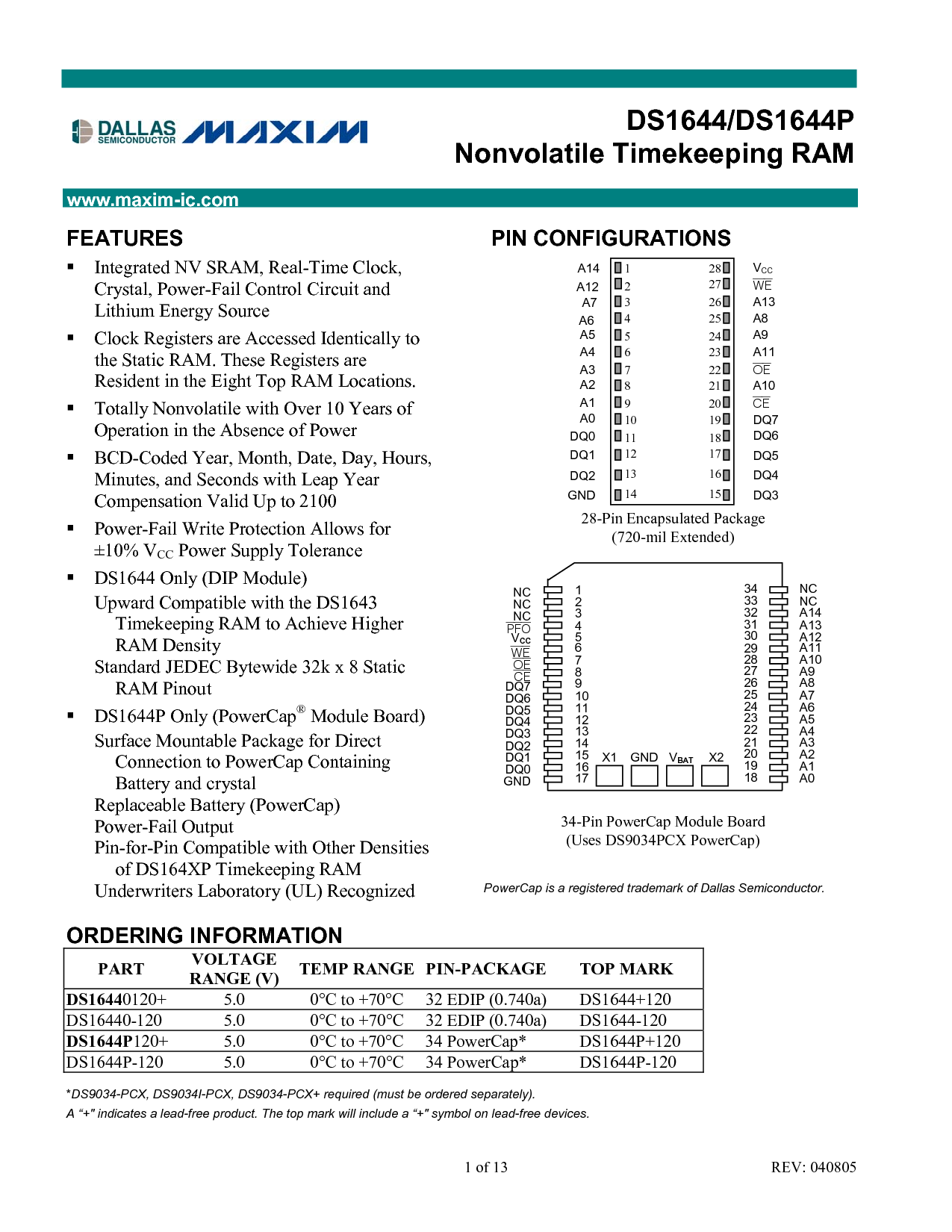ds16440-120 5.0 0°c 至 +70°c 32 edip (0.740a) ds1644-120