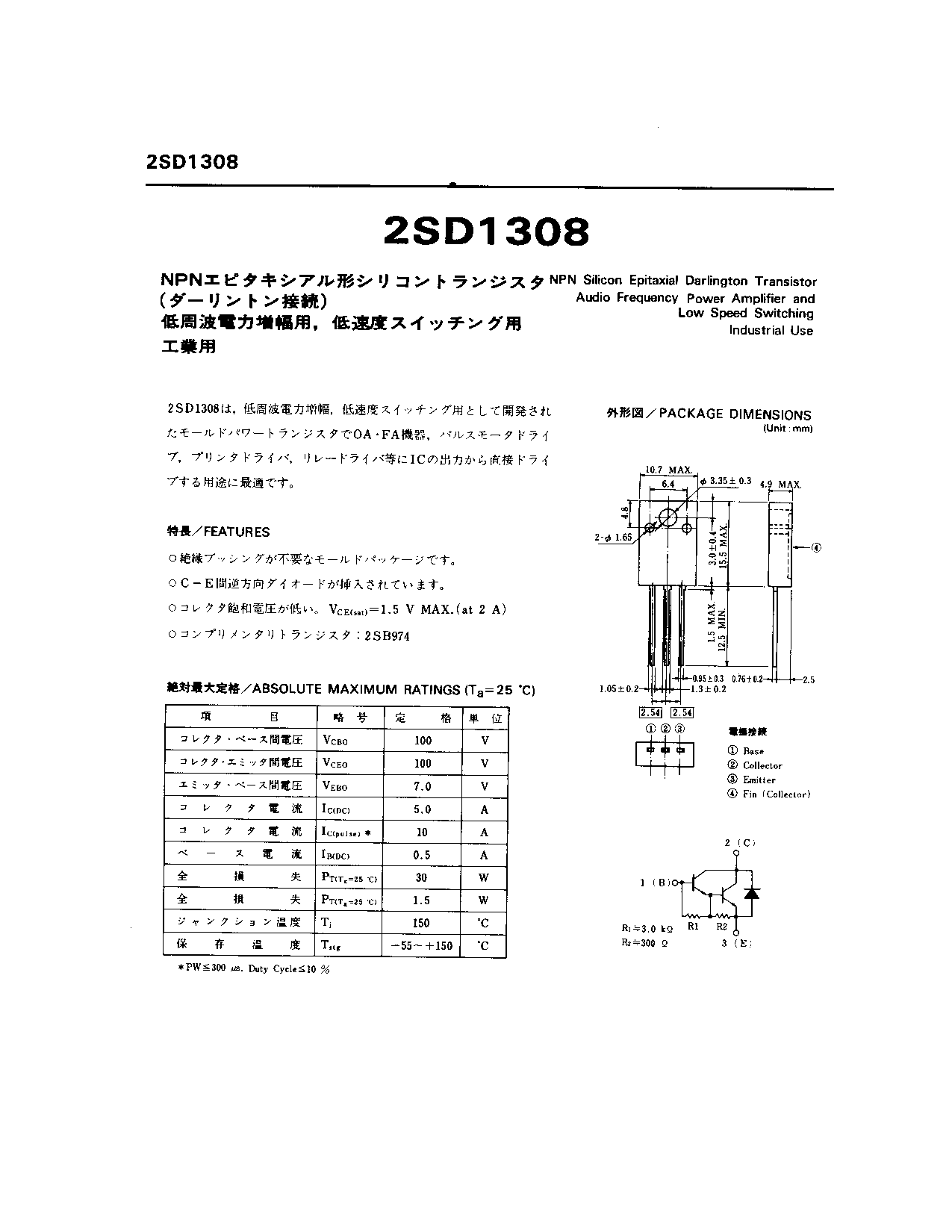 NPN SILICON EPITAXIAL DARLINGTON TRANSISTOR AUDIO FREQUENCY POWER AMPLIFIER AND LOW SPEED SWITCHING INDUSTRIAL USE