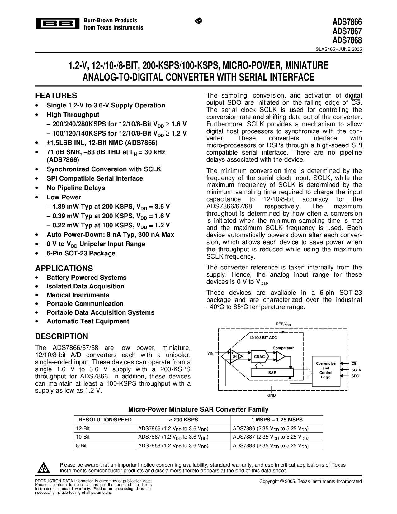 1.2-V, 12-/10-/8-BIT, 200-KSPS/100-KSPS, MICRO-POWER, MINIATURE ANALOG-TO-DIGITAL CONVERTER WITH SERIAL INTERFACE
