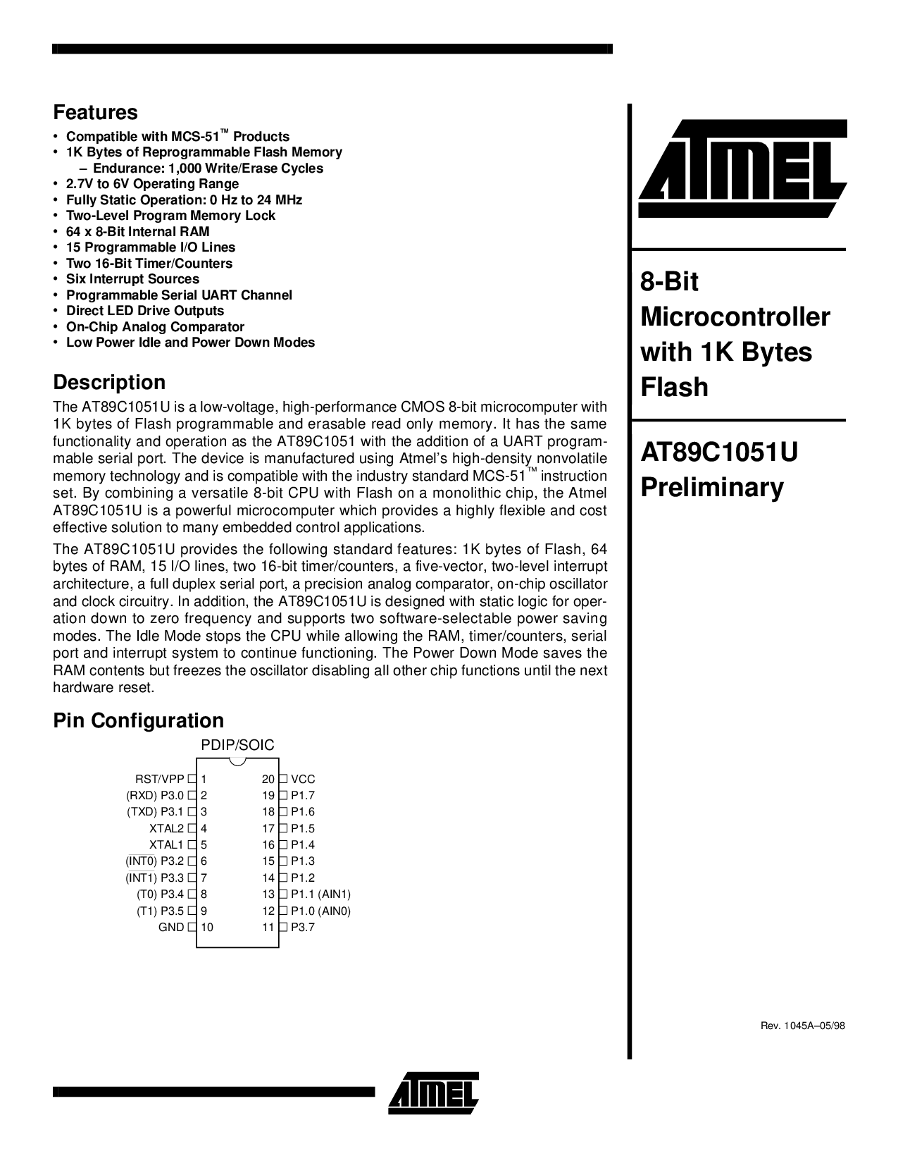 这 at89c1051u 是 一个 低-电压, 高性能 cmos 8-有点 微型计算机 与