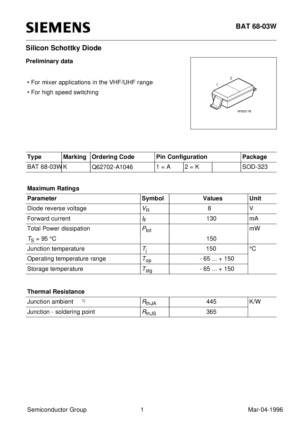Silicon Schottky Diode (For mixer applications in the VHF/UHF range For high speed switching)
