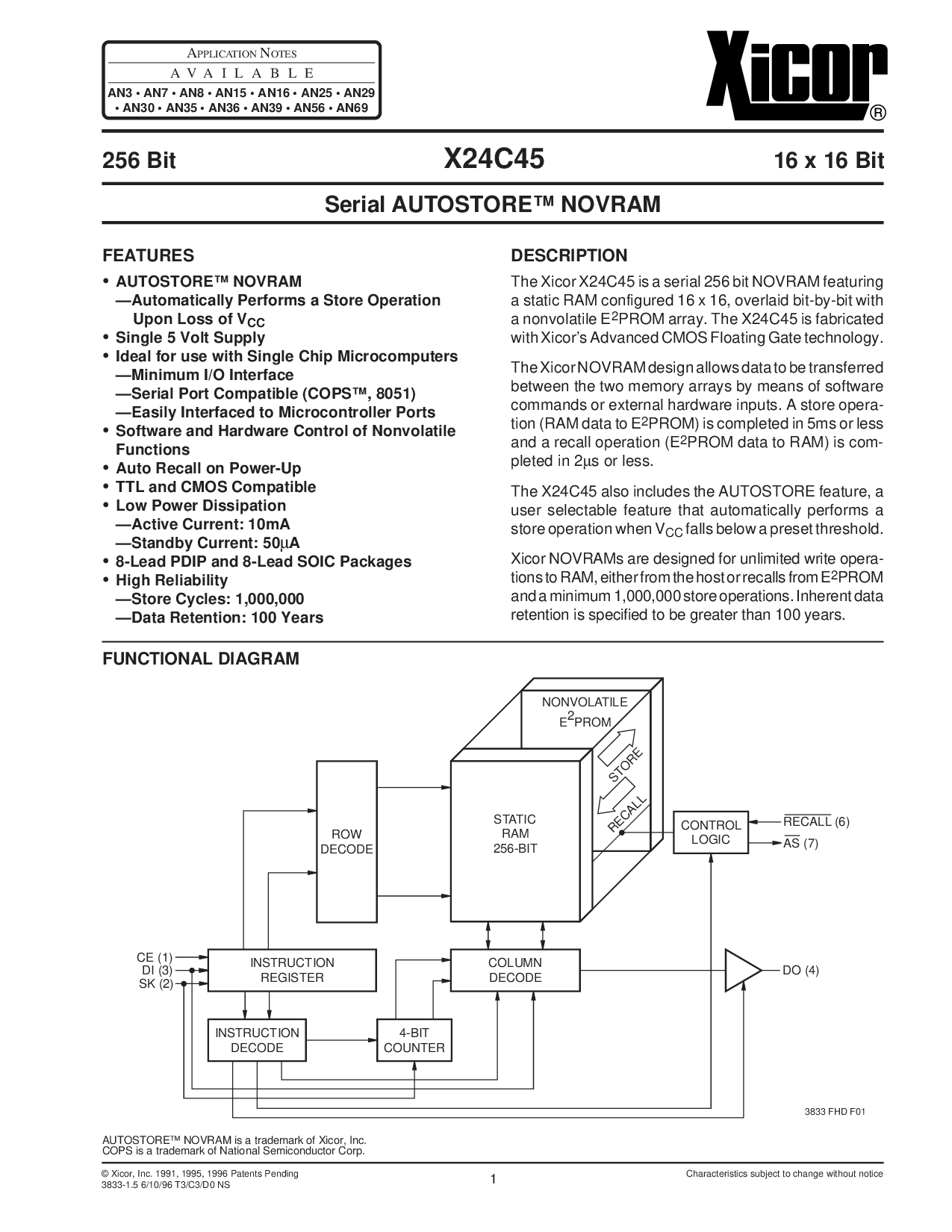 © xicor, 公司 1991, 1995, 1996 专利 待定 特性 主题 至 变更 无 通知