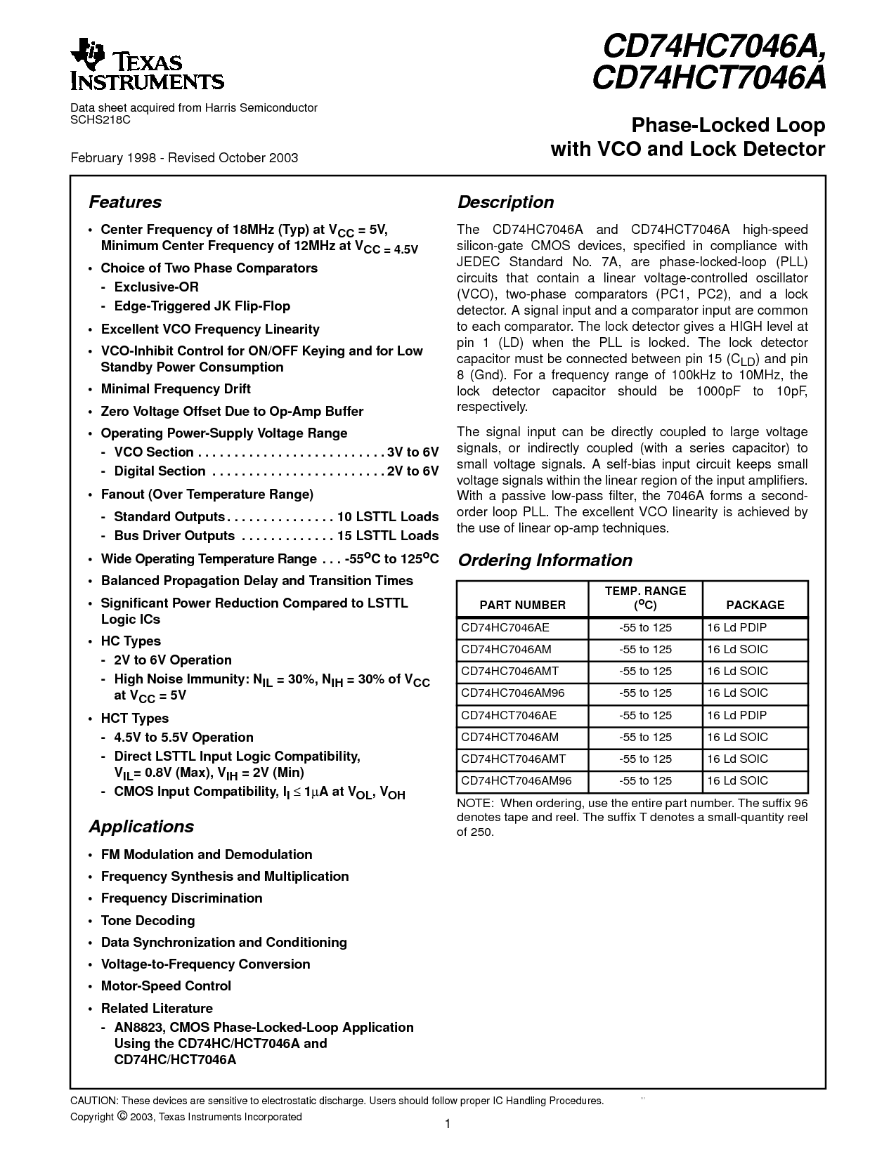 CD74HC7046AM -55 至 125 16 ld soic