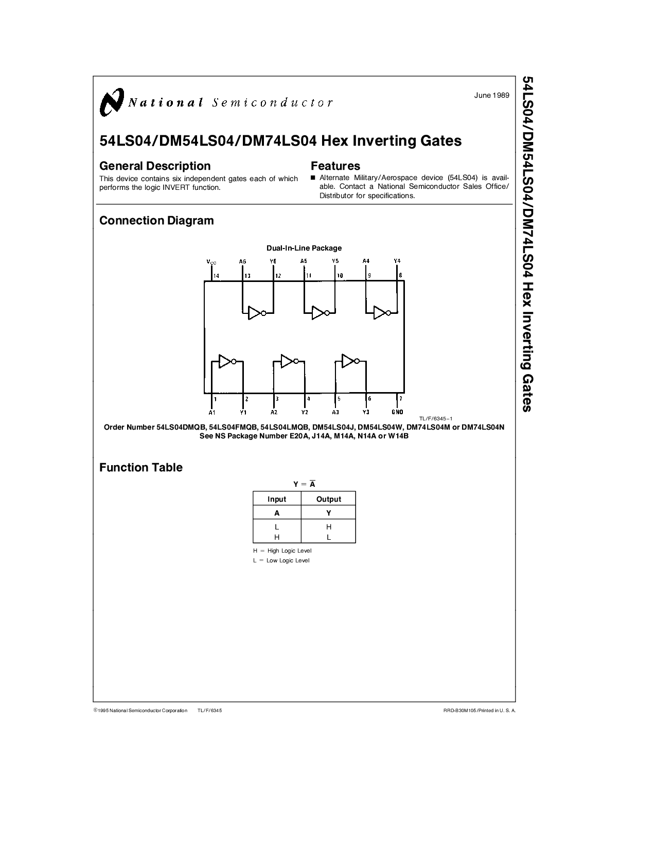 订单 号码 54LS04DMQB 54LS04FMQB 54LS04LMQB DM54LS04J DM54LS04W DM74LS04M 或 DM74LS04N