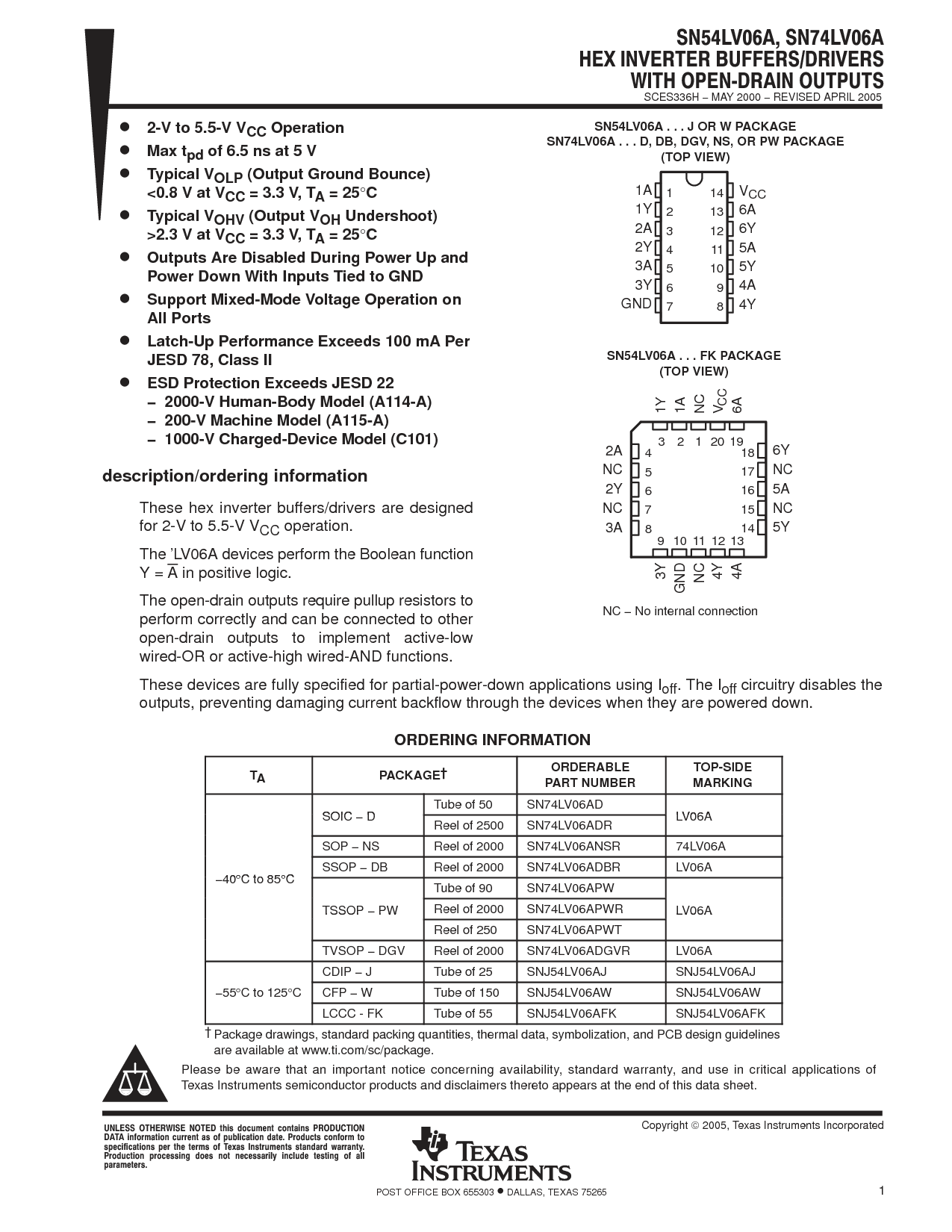 SN74LV06A . . . d, db, dgv, ns, 或 pw 包装
