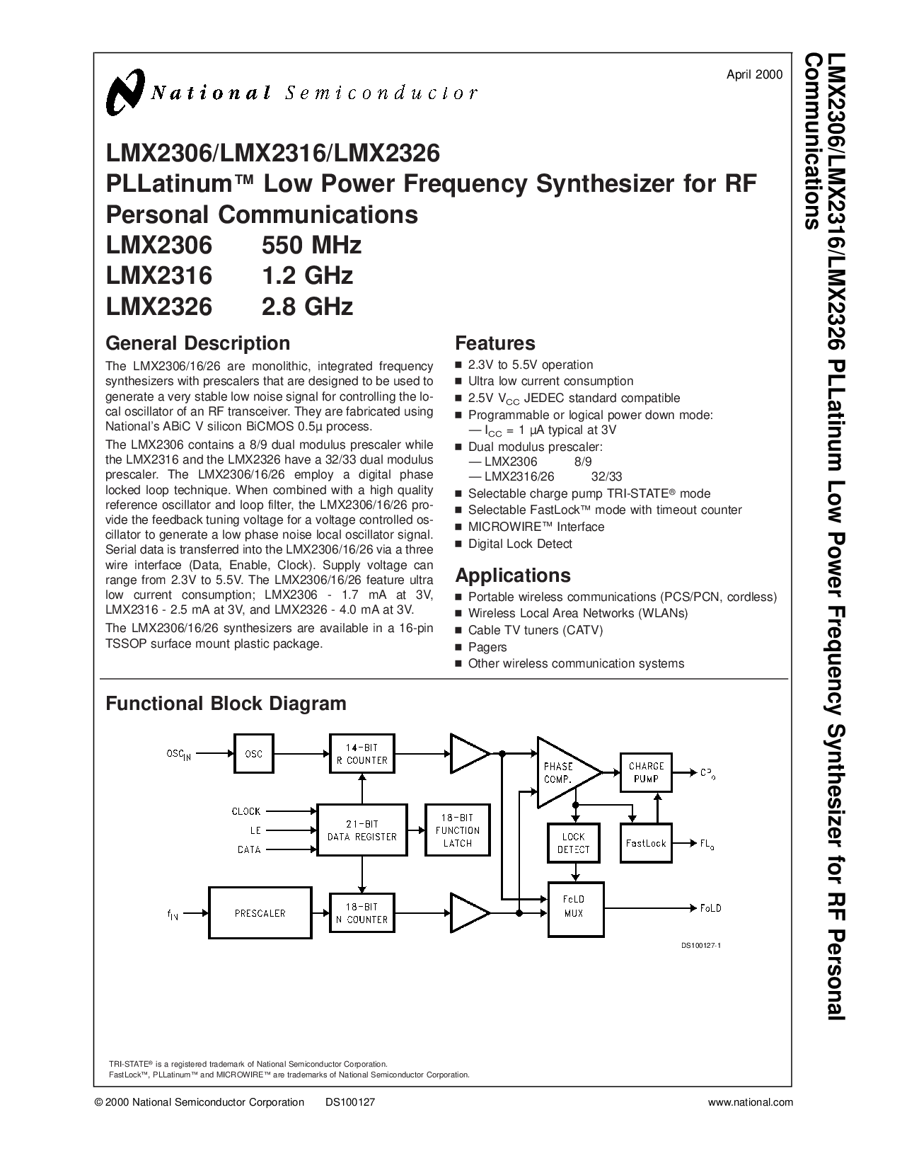 范围 从 2.3v 至 5.5v. 这 lmx2306/16/26 功能 超