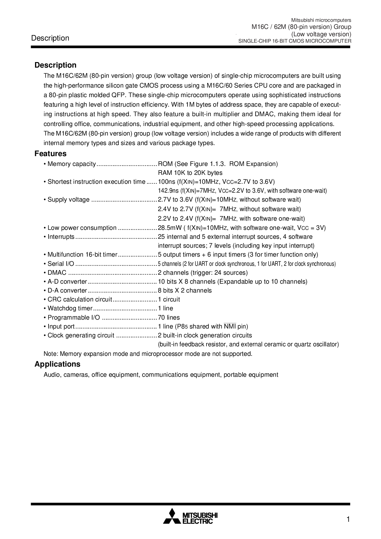 这 m16c/62m (80-管脚 版本) 集团 (低 电压 version) 包括 一个 宽 范围 的 产品 与 不同的