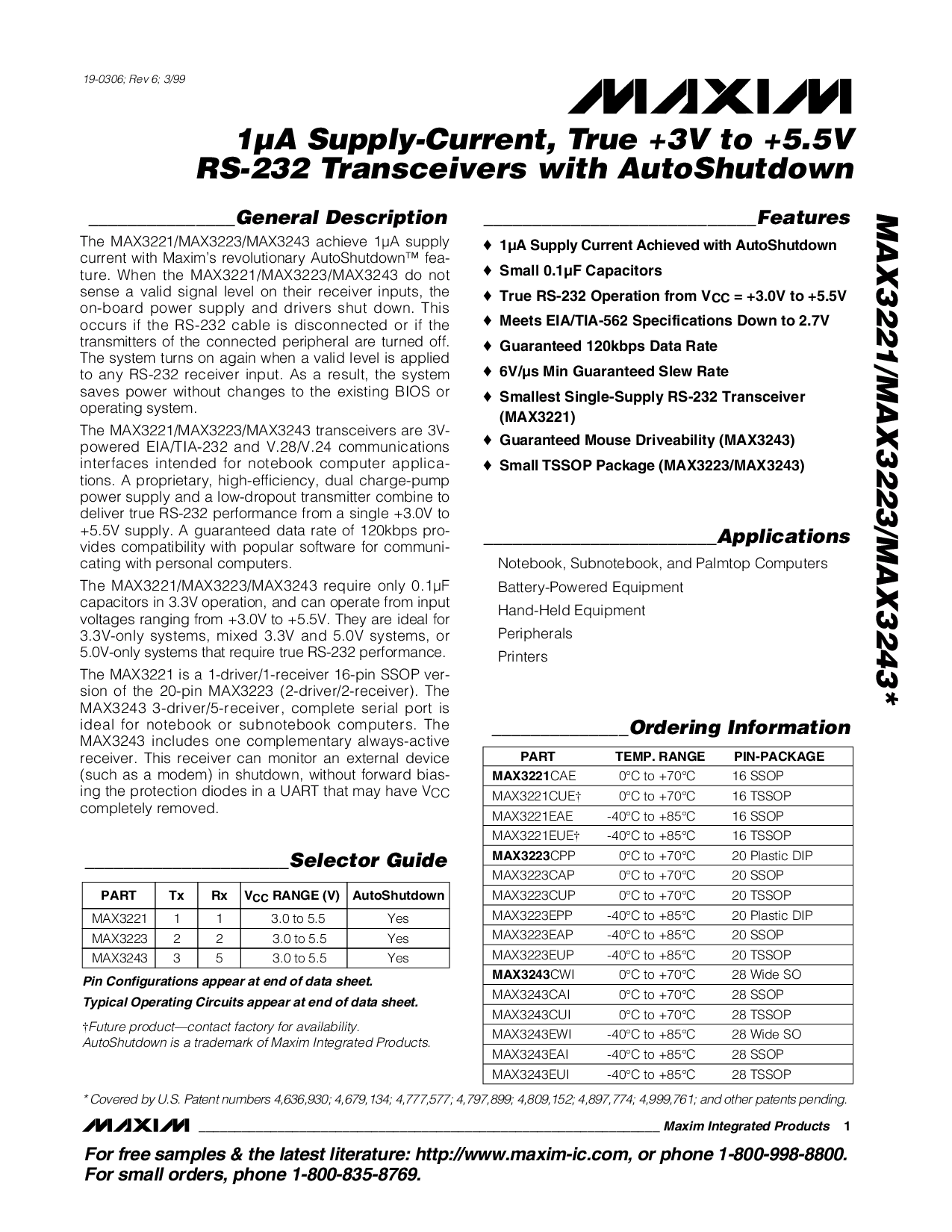 1レA Supply Current, True +3V to +5.5V RS 232 Transceiver with AutoShutdown
