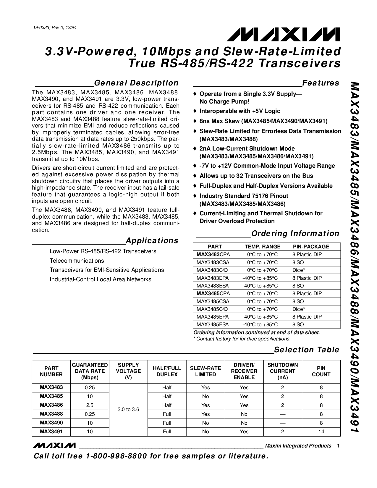 3.3V-Powered, 10Mbps and Slew-Rate-Limited True RS-485/RS-422 Transceivers