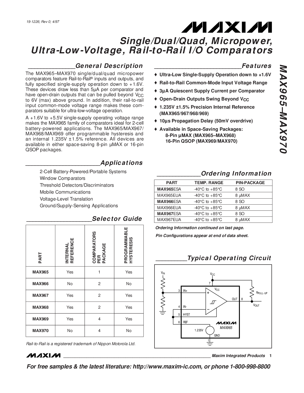 这 max965–max970 单独/双/四边形 微功率