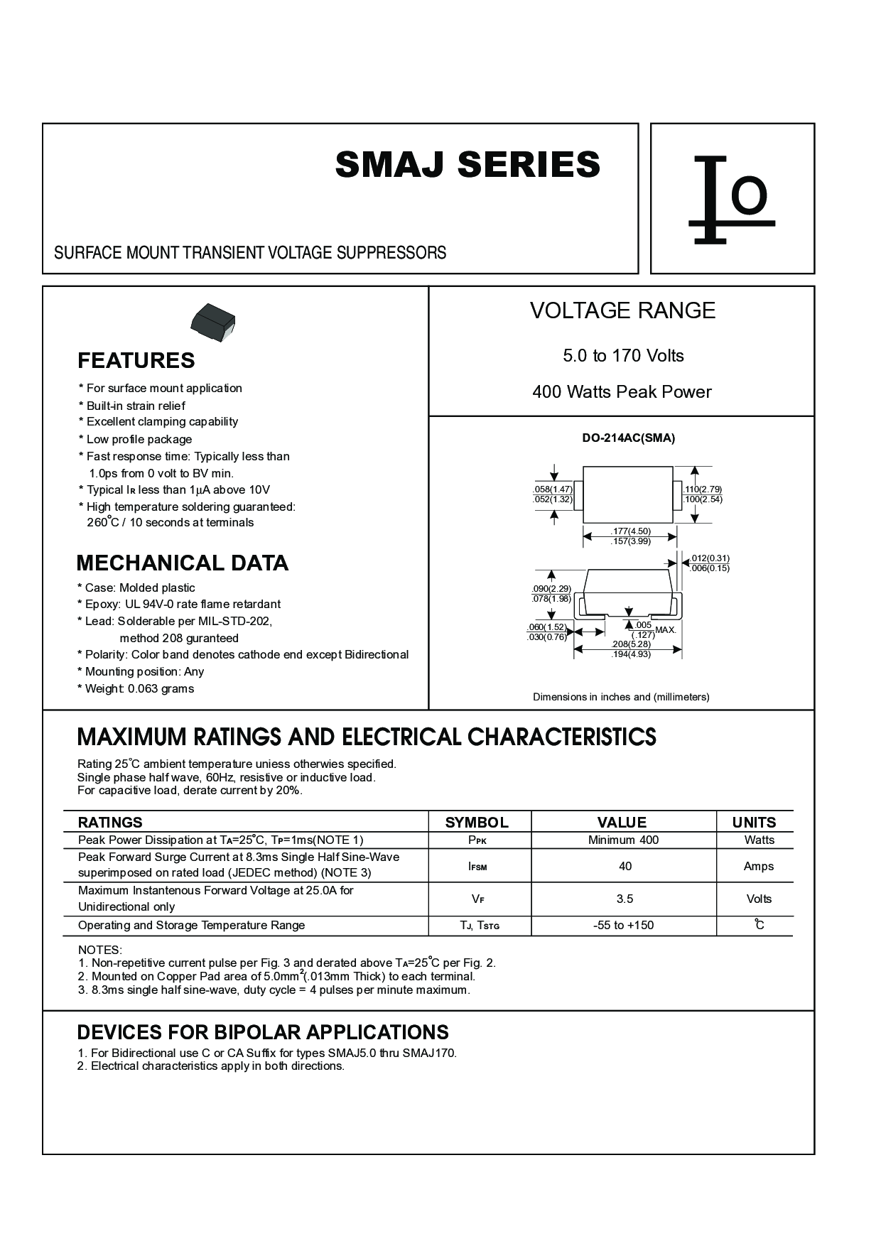 400W SURFACE MOUNT TRANSIENT VOLTAGE SUPPRESSOR