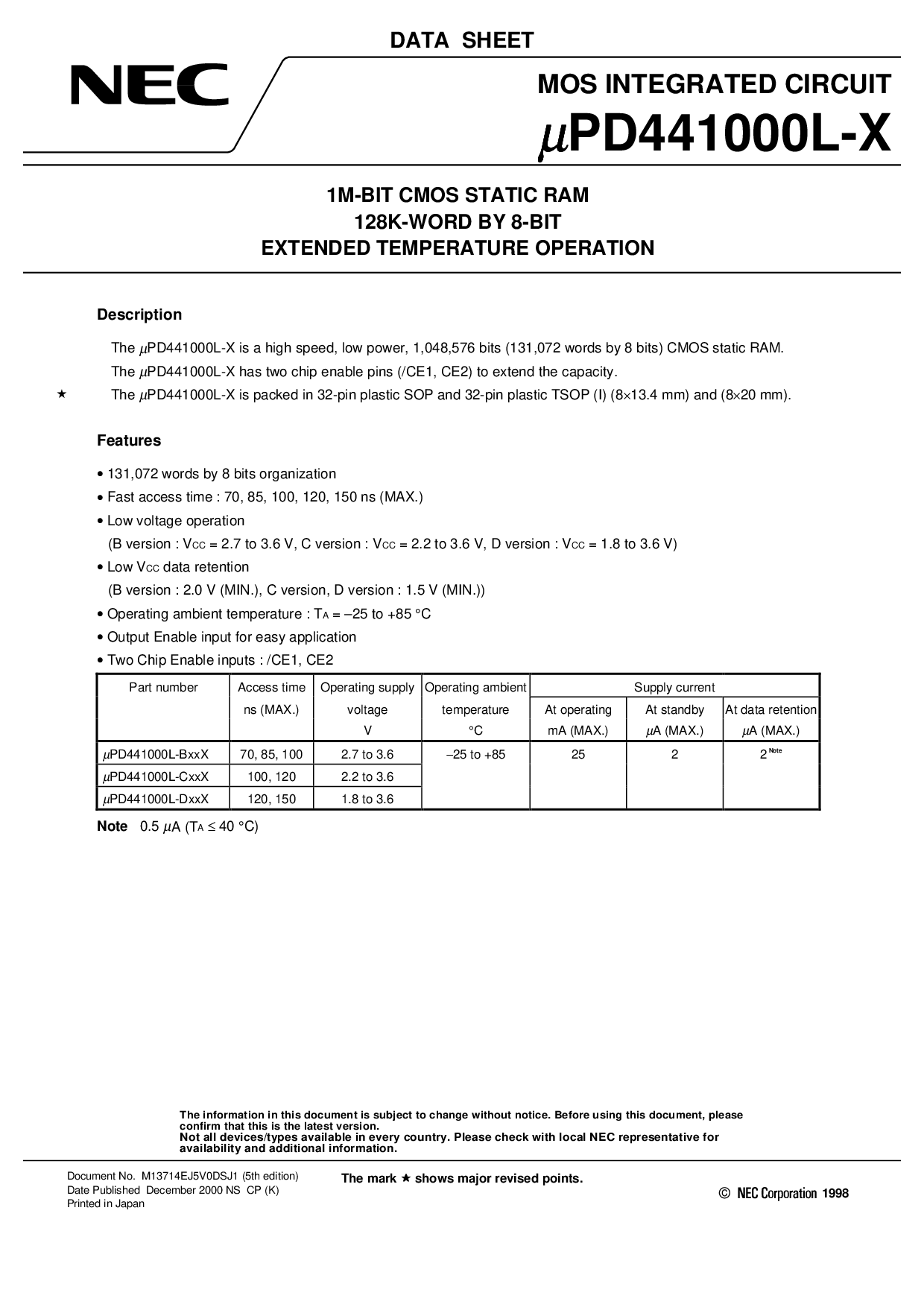 pd441000l-x 是 一个 高 速度, 低 电源, 1,048,576 比特 (131,072 字词 由 8 bits) cmos 静态 ram.