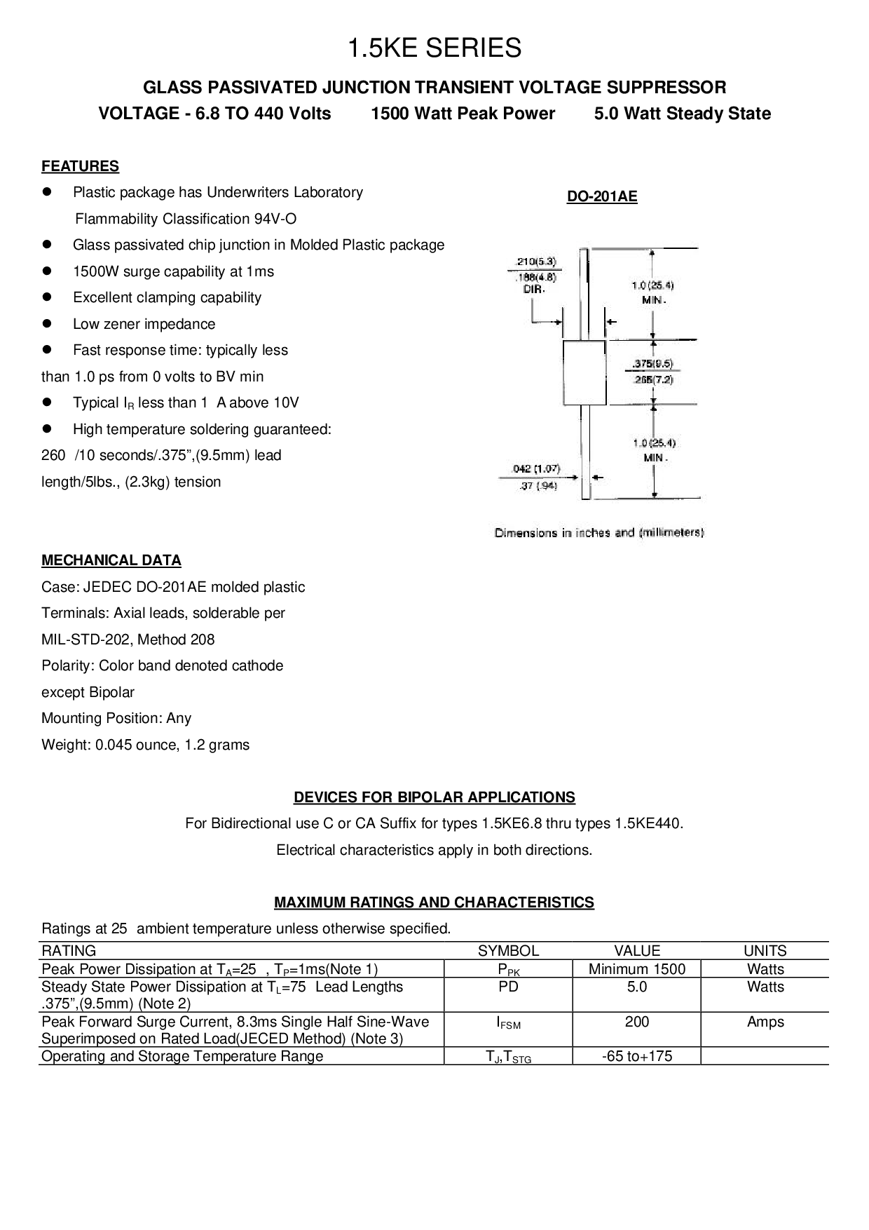 用于 双向 使用 c 或 ca 后缀 用于 类型 1.5ke6.8 直通 类型 1.5ke440.