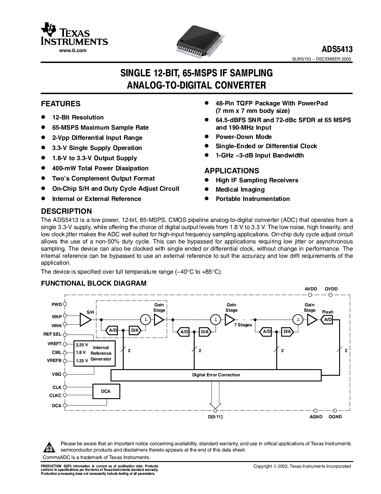 这 ads5413 是 一个 低 电源, 12-有点, 65-msps, cmos 管道 模数转换 变频器 (adc) 那 操作 从 一个