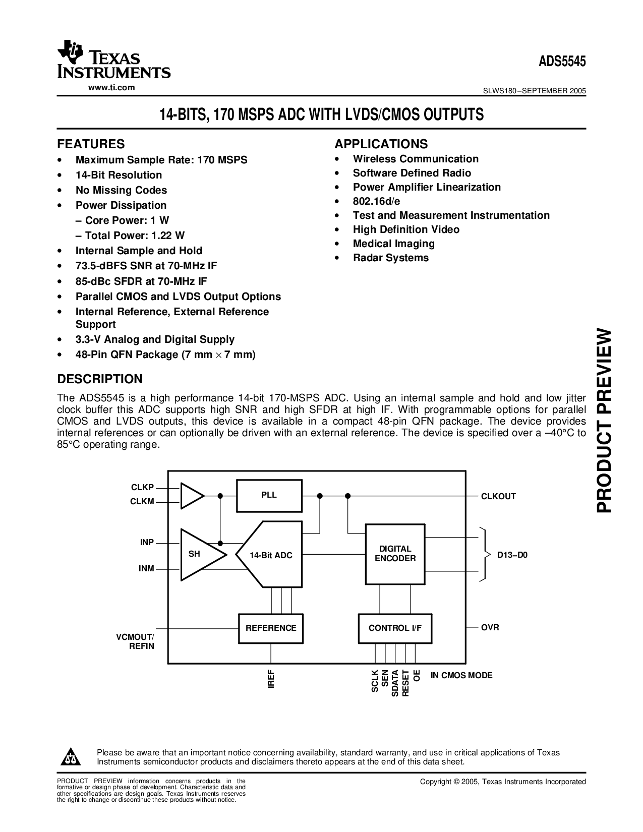 theads5545isahighperformance14-bit170-mspsadc.usinganinternalsampleandholdandlowjitter