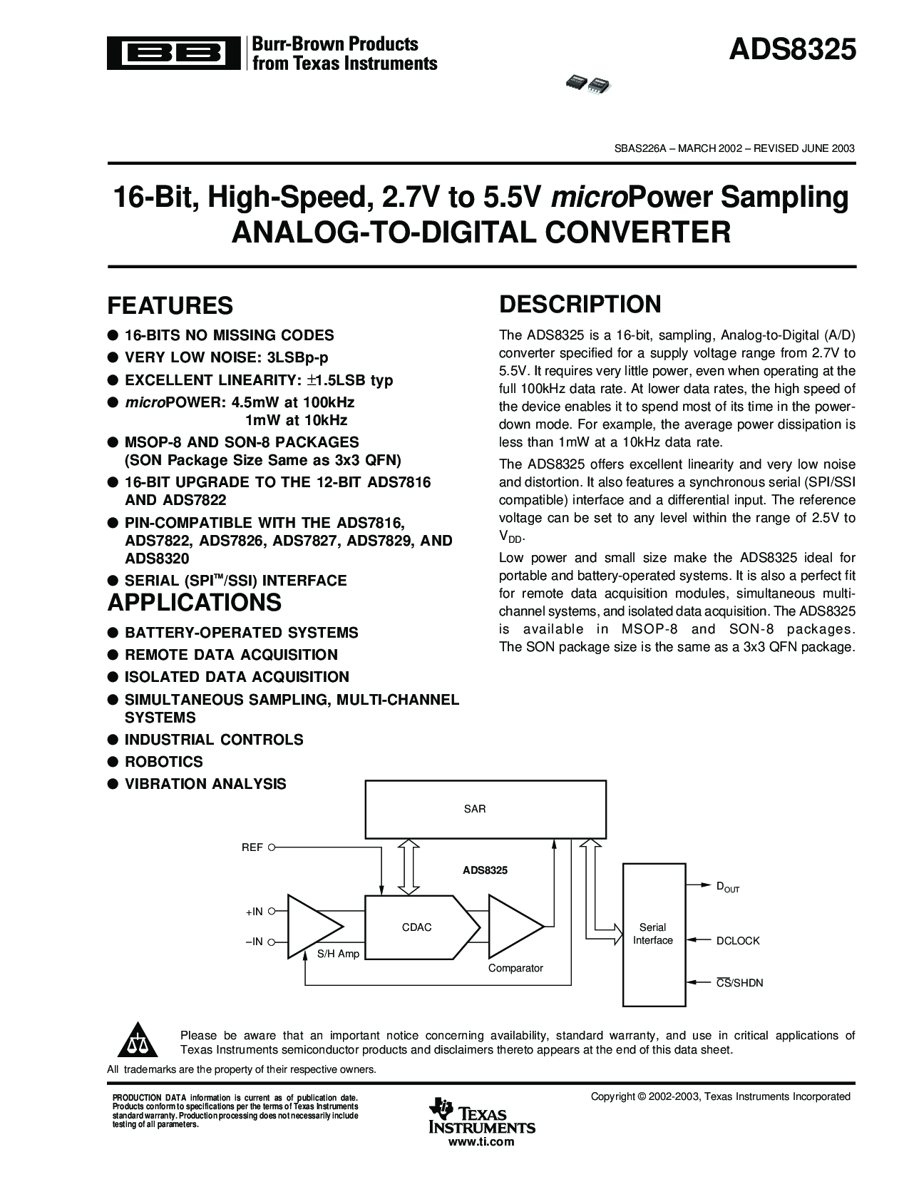 sbas226a – march 2002 – 修订 六月 2003