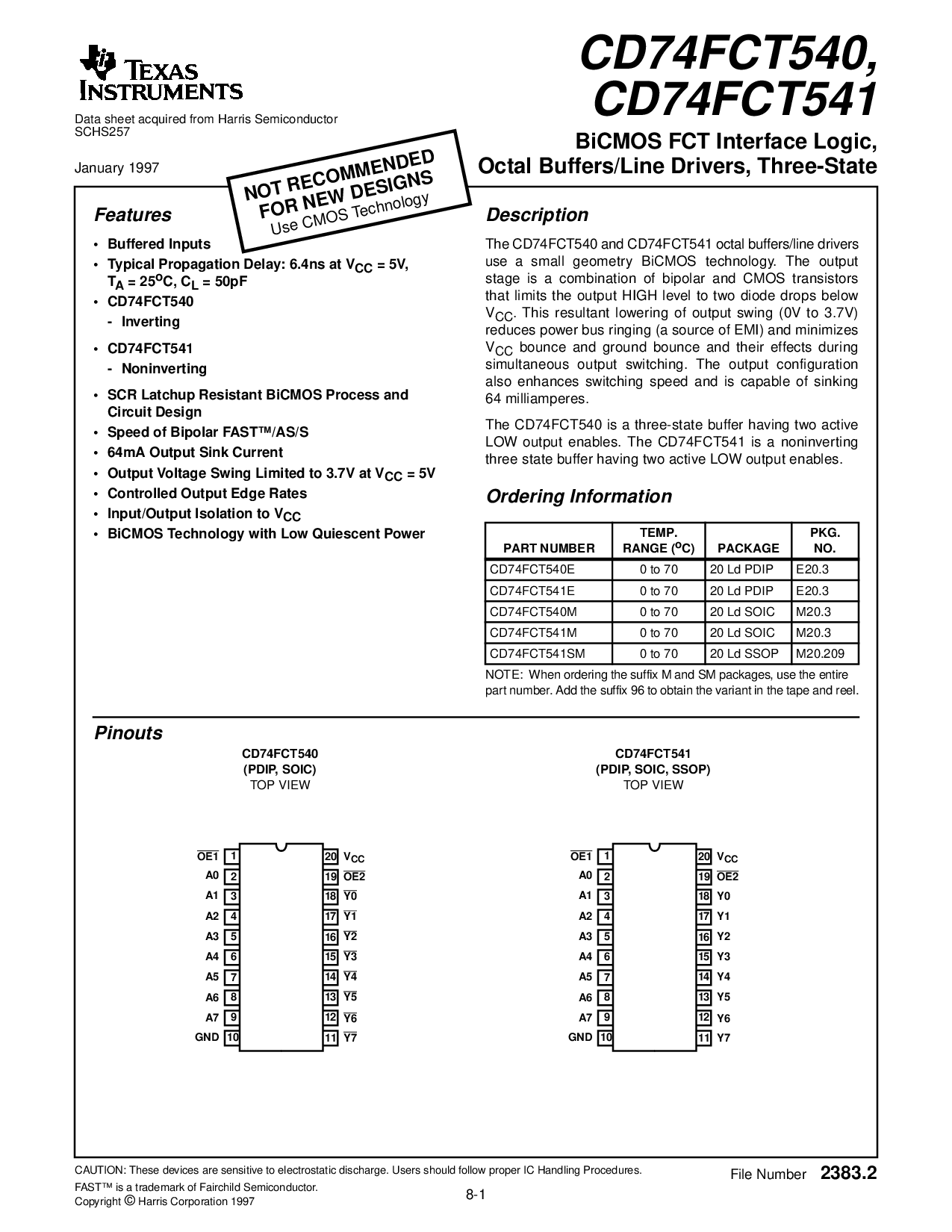 这 CD74FCT540 和 CD74FCT541 八进制 缓冲区/线 驱动程序