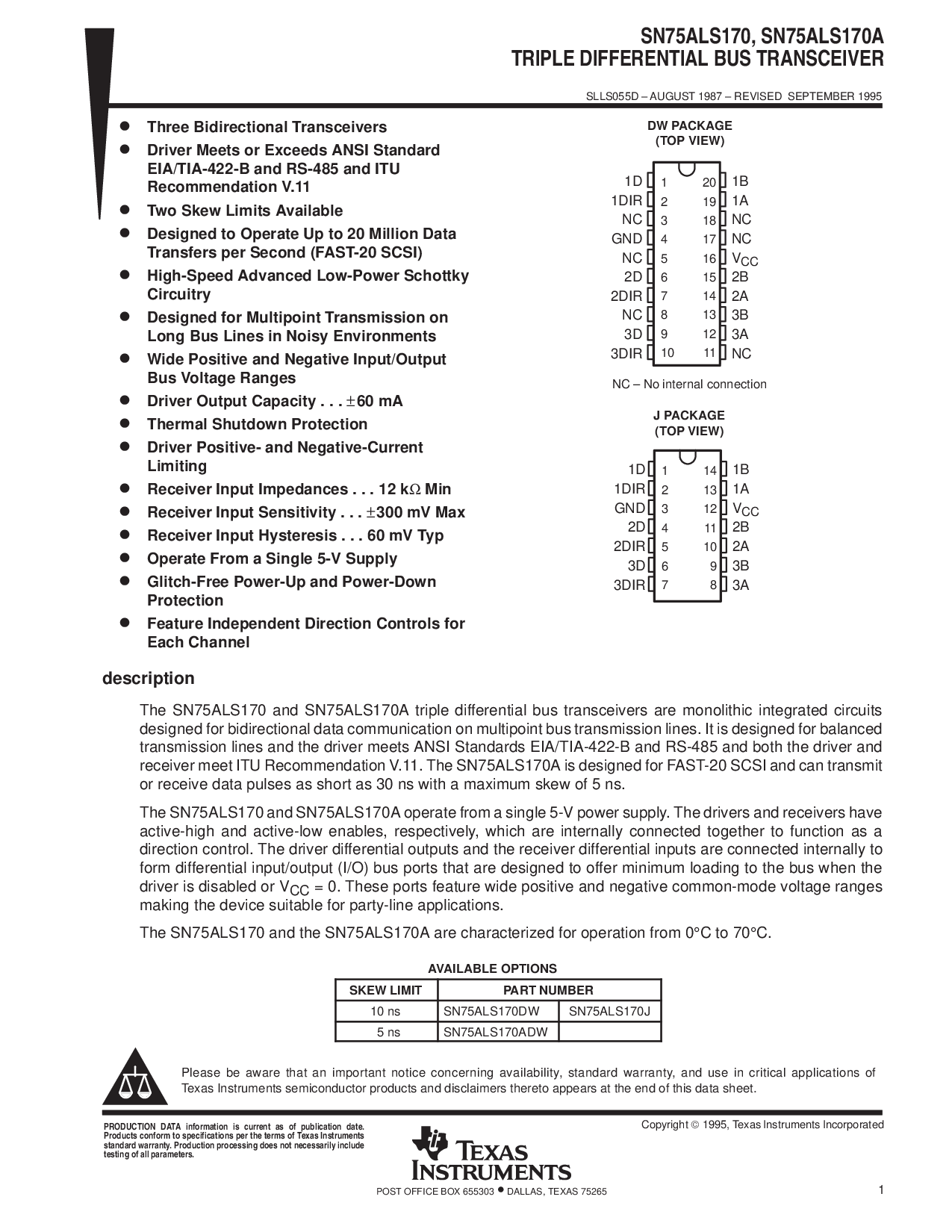 接收器 满足 itu 建议 v.11. 这 sn75als170a 是 设计 用于 快-20 scsi 和 可以 发送
