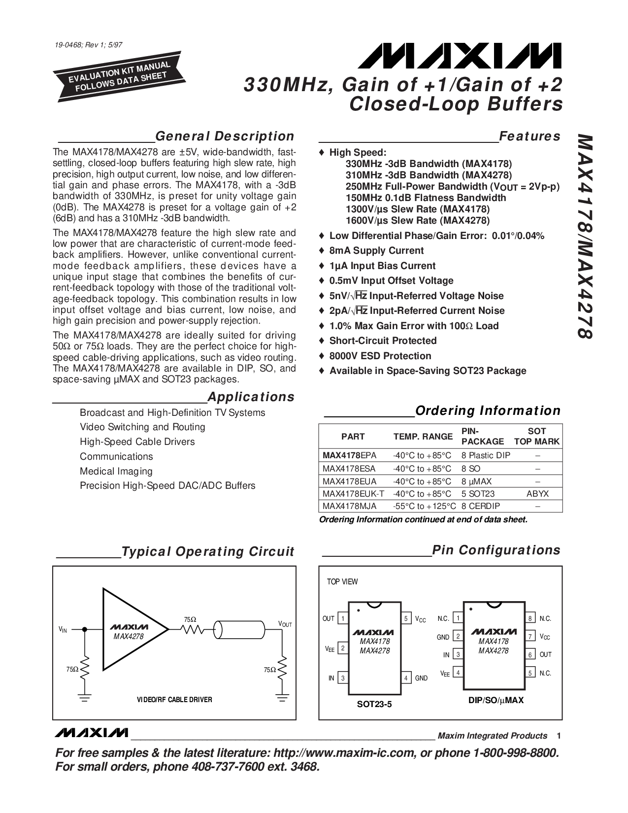 用于 免费 样品 &放大器; 这 最新 文学: http://www.马克西姆-集成电路.com, 或 电话 1-800-998-8800.