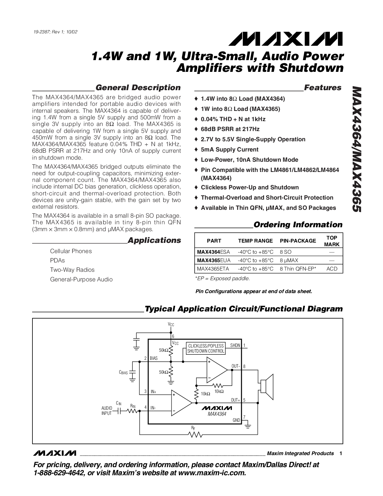 内部 扬声器. 这 max4364 是 有能力 的 交付-