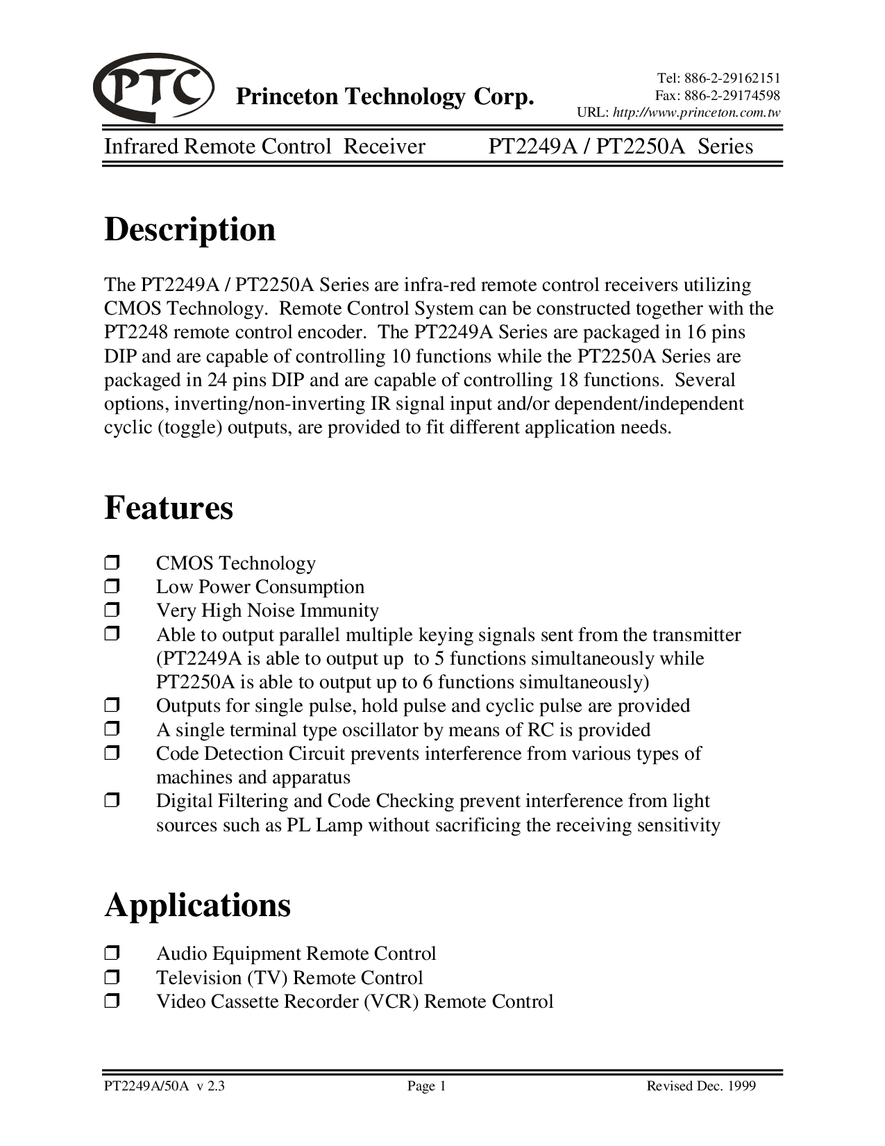 pt2249a/50a v 2.3 第页 1 修订 12月. 1999