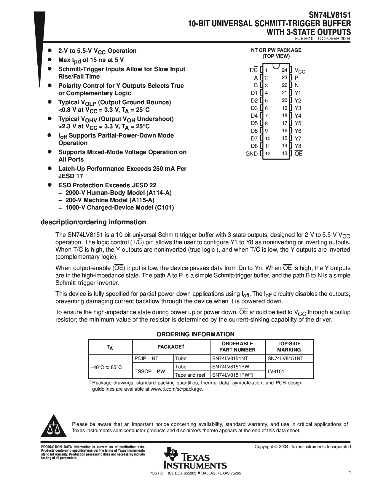 这 sn74lv8151 是 一个 10-有点 通用 施密特-触发器 buffer 与 3-州 产出, 设计 用于 2-v 至 5.5-v v