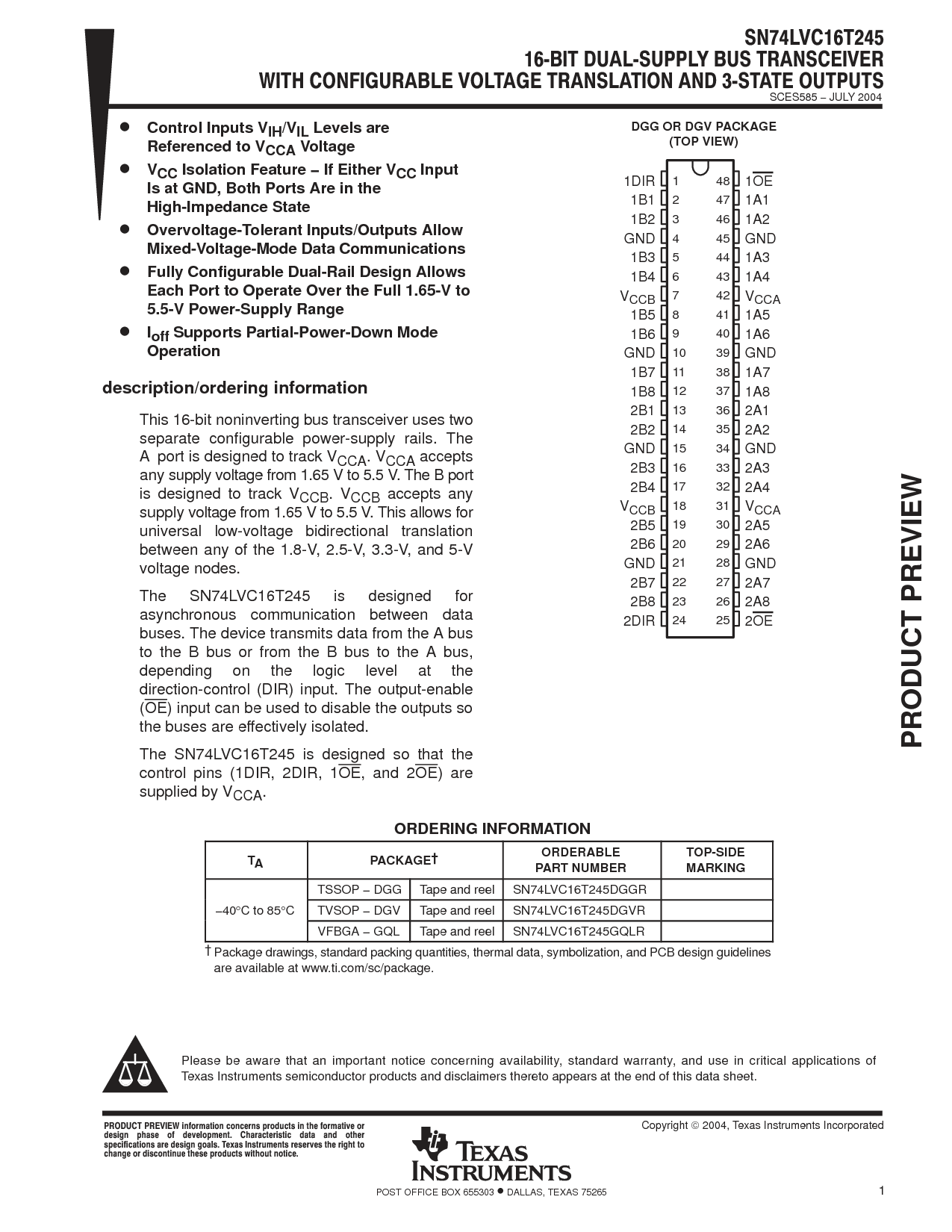tvsop − dgv 胶带 和 卷轴 SN74LVC16T245DGVR−40 c 至 85 c