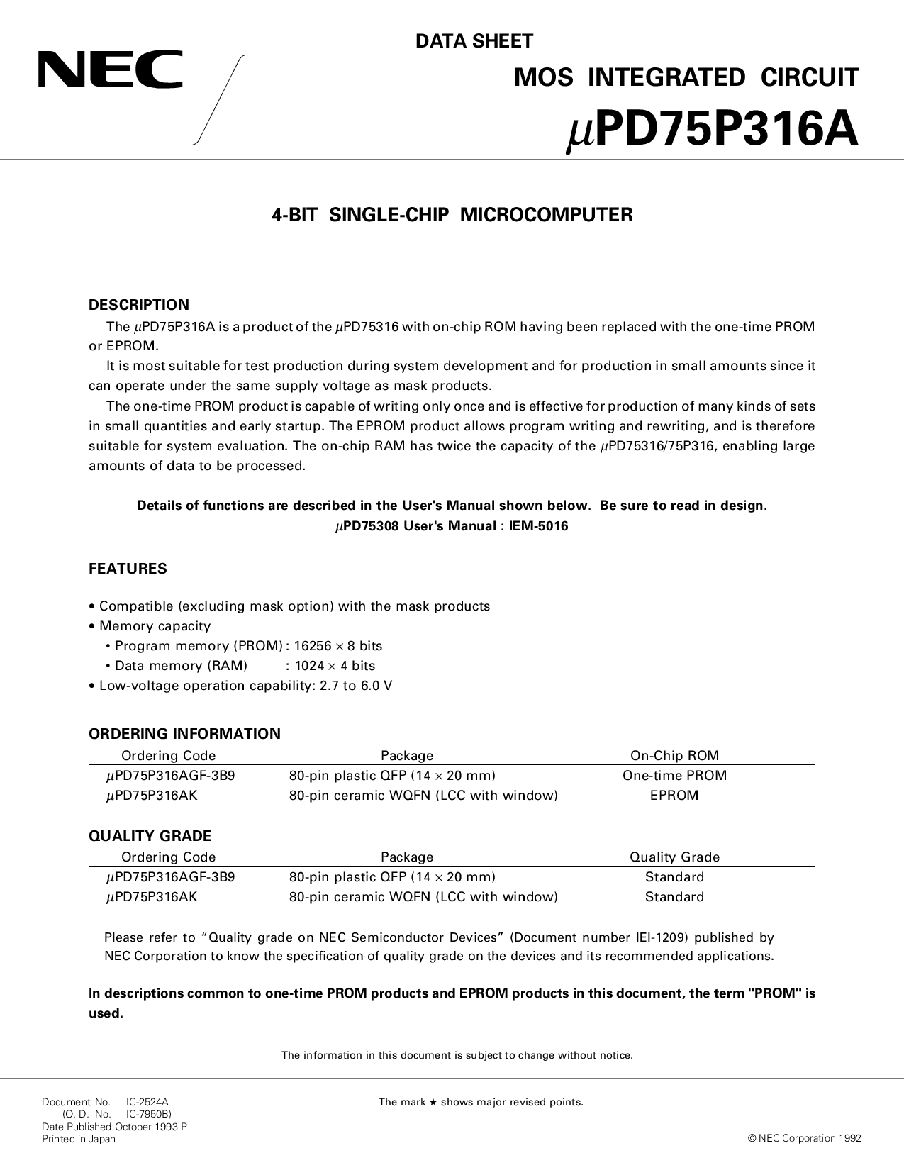 PD75P316AK 80-管脚 陶瓷 wqfn (lcc 与 窗口) 非易失存储器