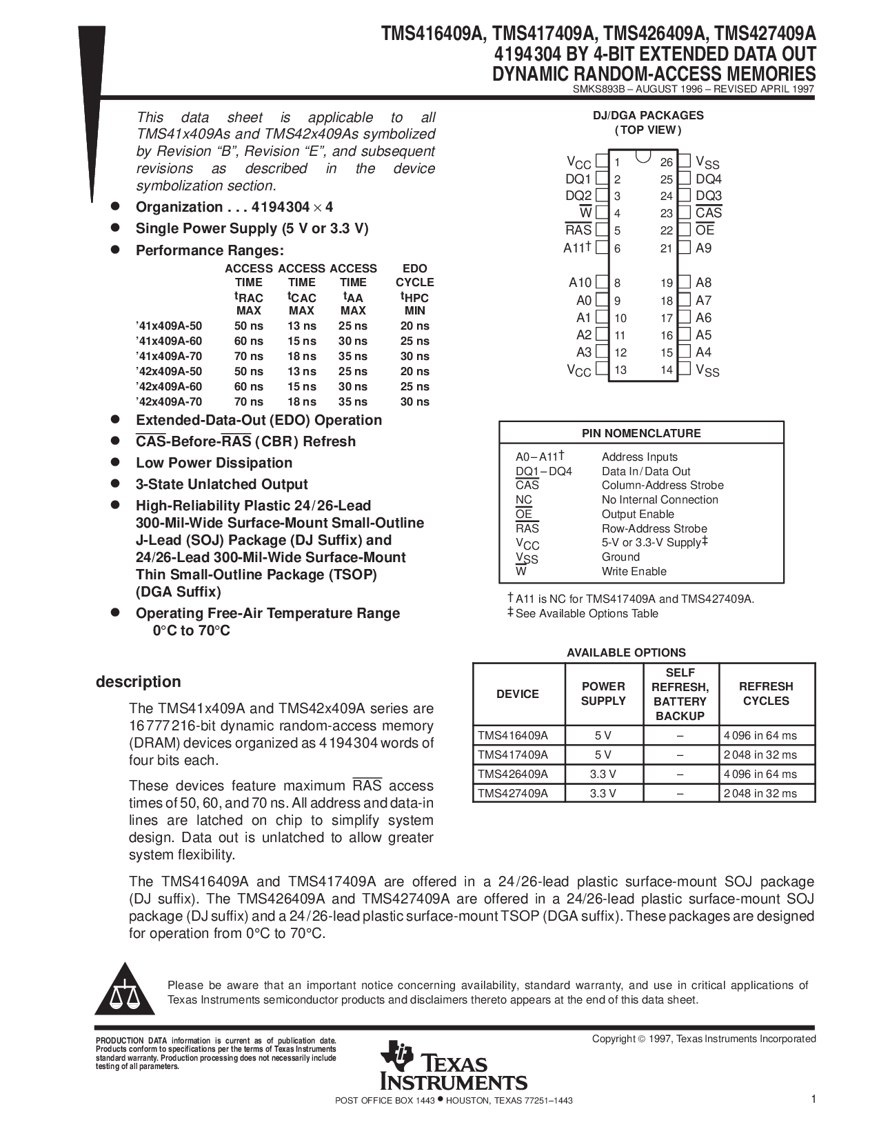 TMS427409A 3.3 v – 2 048 入点 32 ms