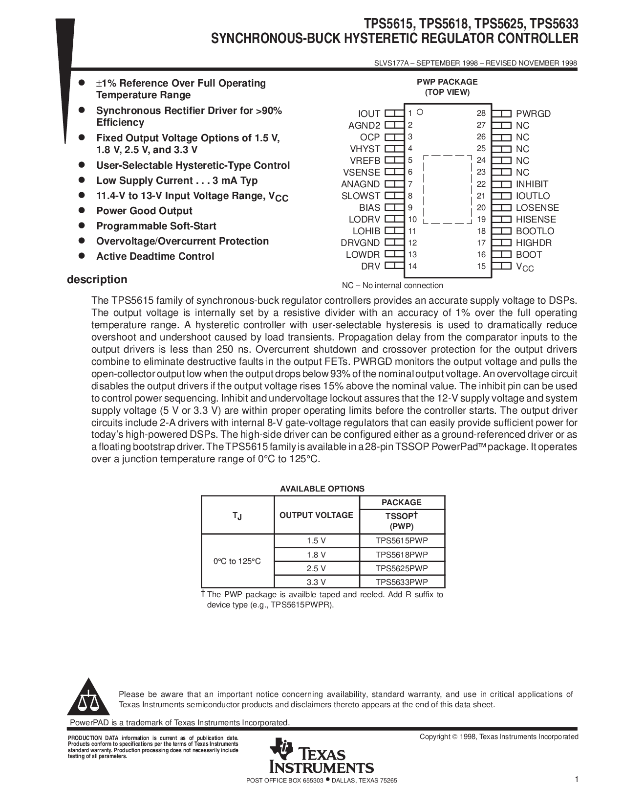 一个 浮动 引导程序 驾驶员. 这 tps5615 家庭 是 可用 入点 一个 28-管脚 tssop powerpad