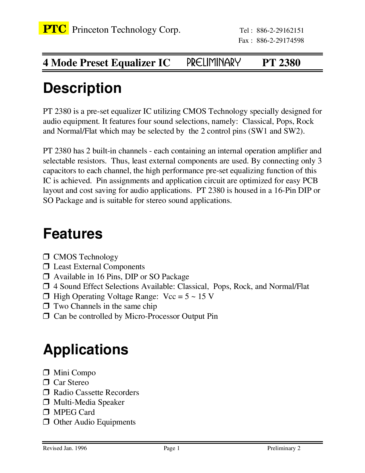 pt 2380 是 一个 预设 均衡器 集成电路 利用 cmos 技术 特别 设计 用于