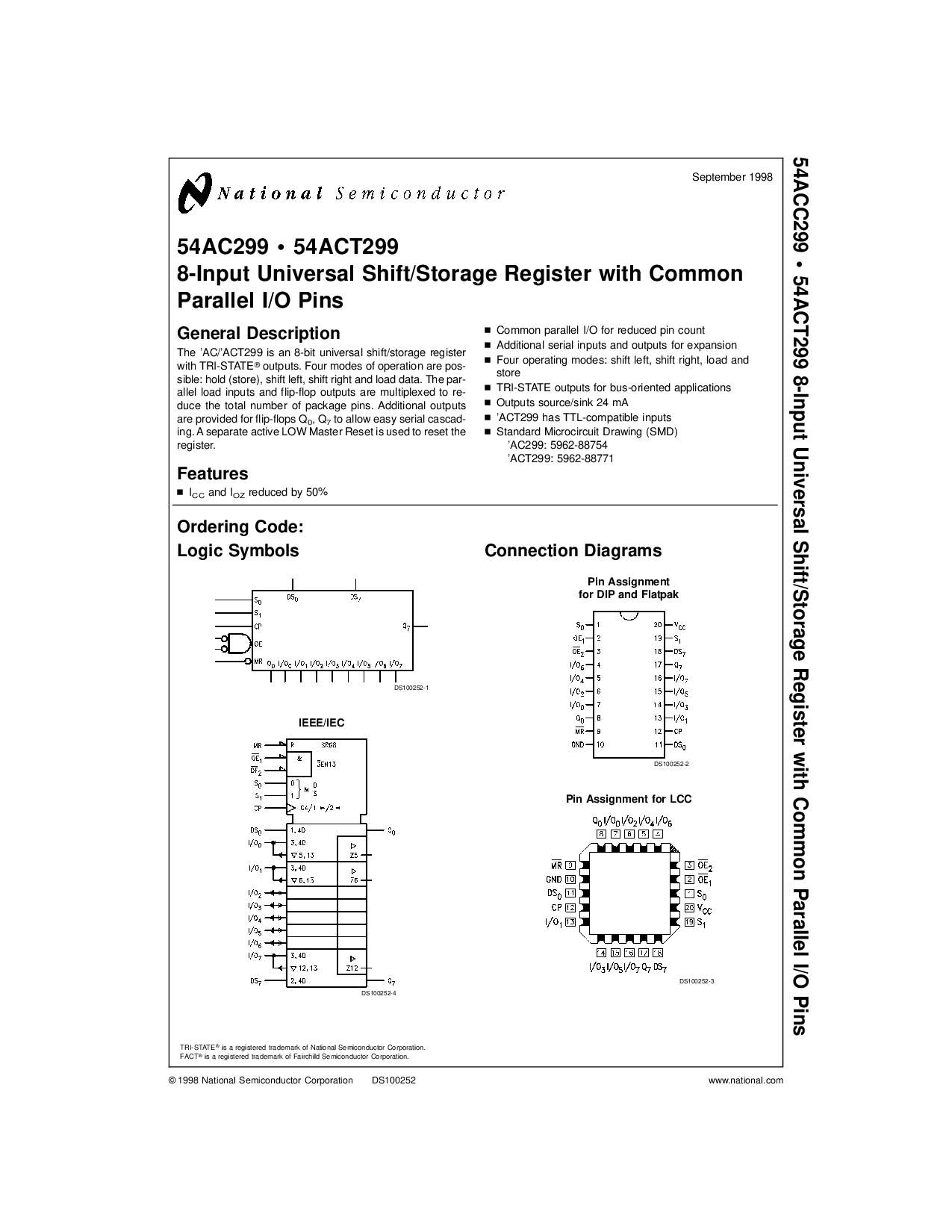 54ACT299 8-输入 通用 轮班/存储 注册 与 普通 平行 我/o 针脚