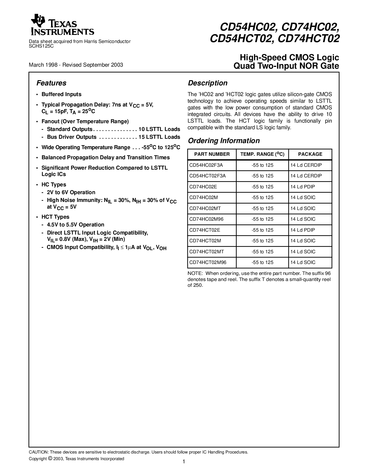 CD54HC02F3A -55 至 125 14 ld cerdip