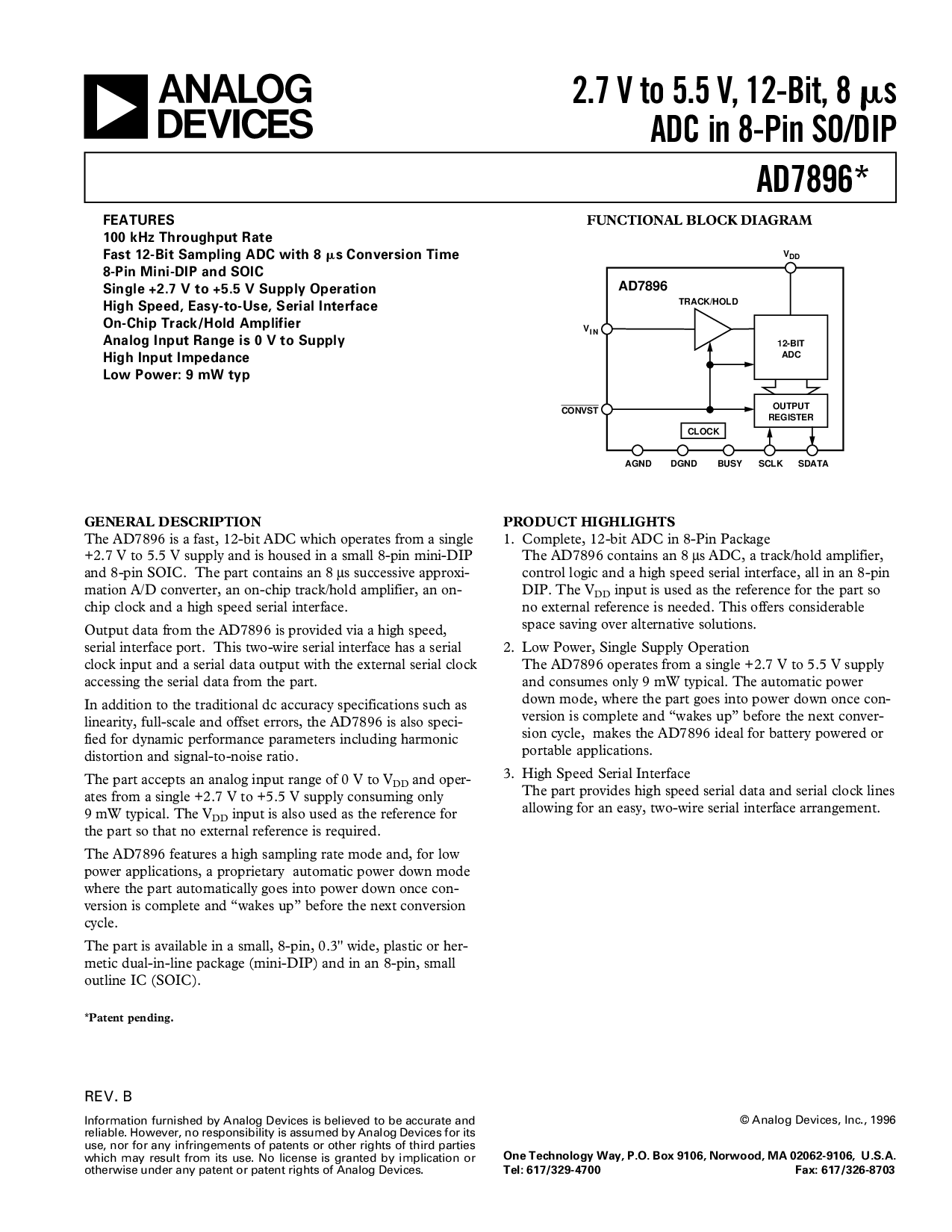 2.7 V to 5.5 V, 12-Bit, 8 us ADC in 8-Pin SO/DIP