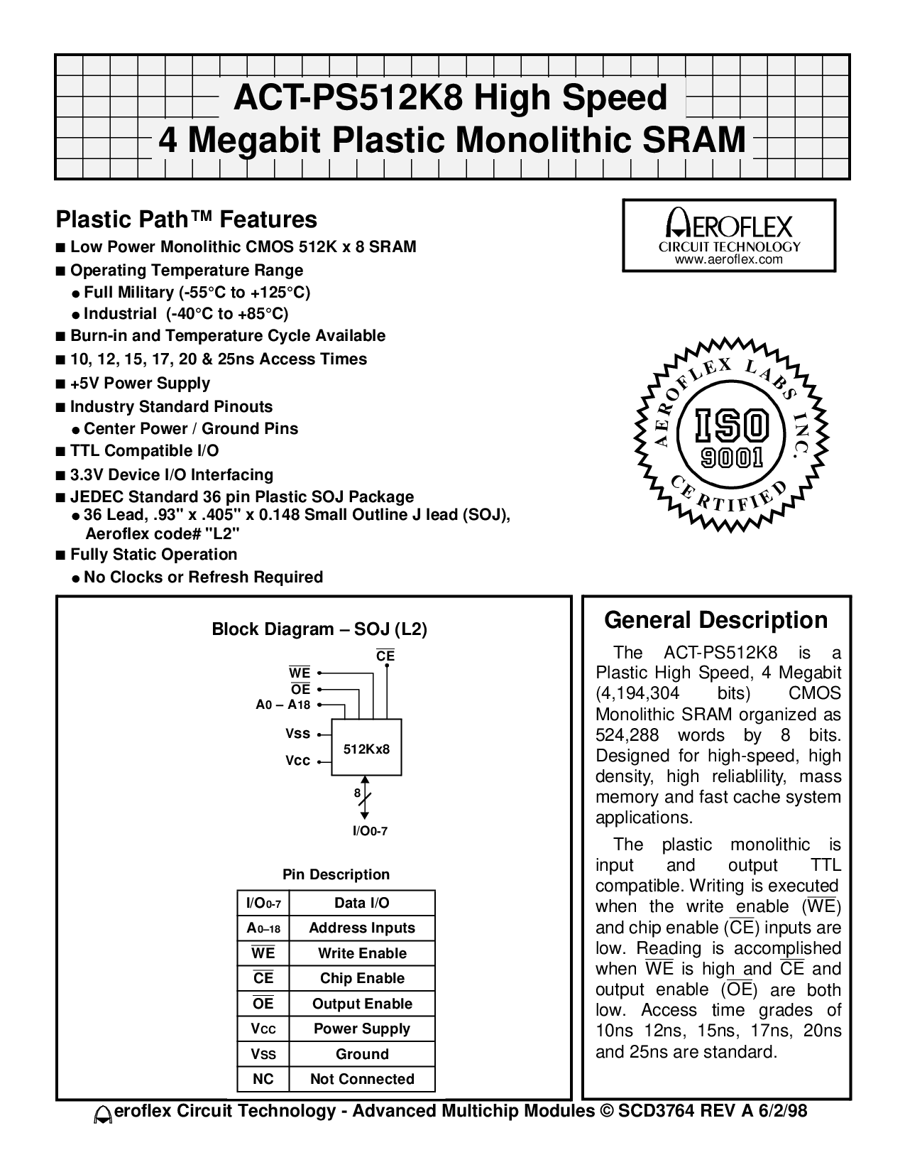 ACT-PS512K8 High Speed 4 Megabit Plastic Monolithic SRAM