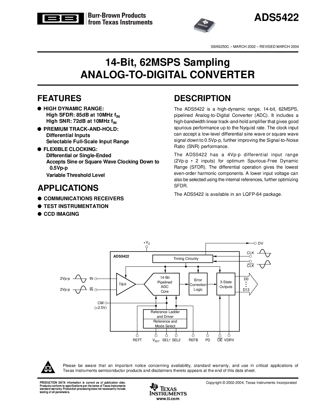 这 ads5422 是 一个 高动态 范围, 14-有点, 62msps,