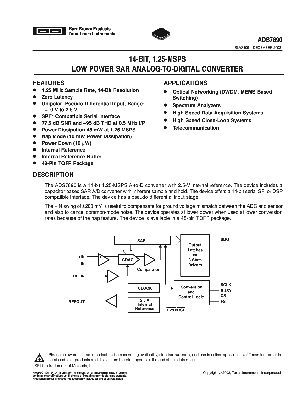 这 ads7890 是 一个 14-有点 1.25-msps 一个-至-d 变频器 与 2.5-v 内部 reference. 这 设备 包括 一个