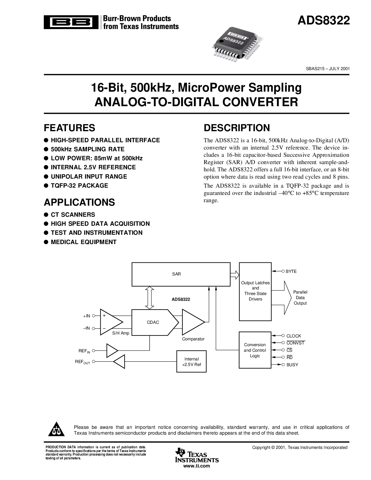 这 ads8322 是 一个 16-有点, 500khz 模数转换 (一个/d)