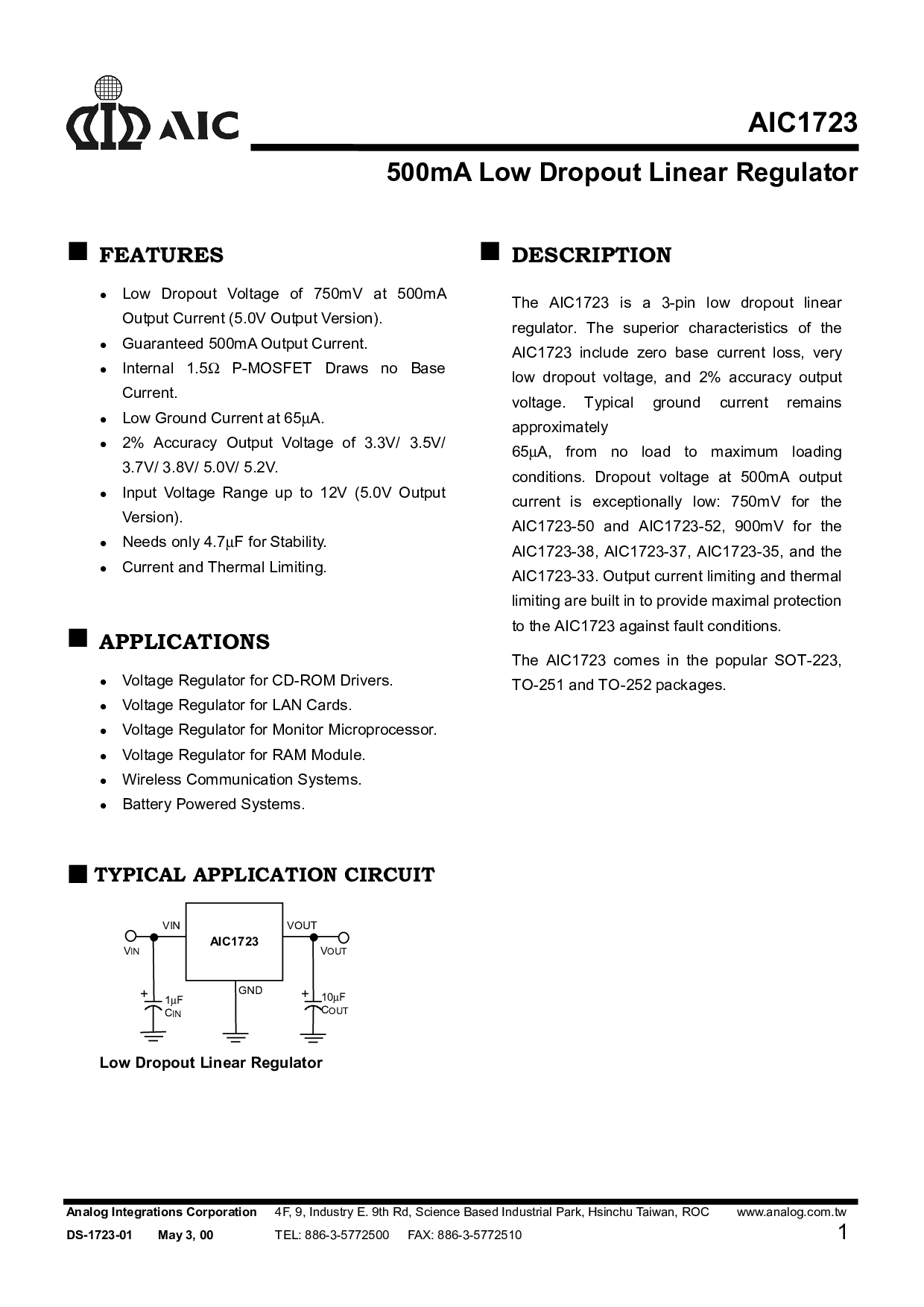 这 aic1723 是 一个 3-管脚 低 辍学 线性