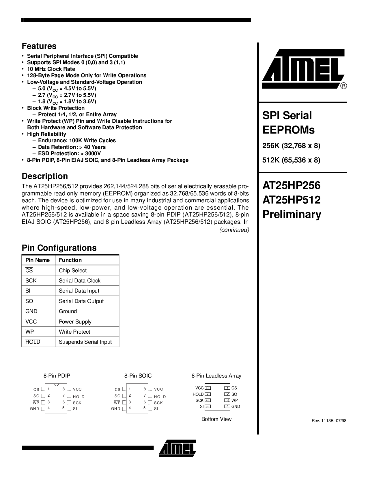 这 at25hp256/512 提供 262,144/524,288 比特 的 串行 电气 可擦除 专业版-