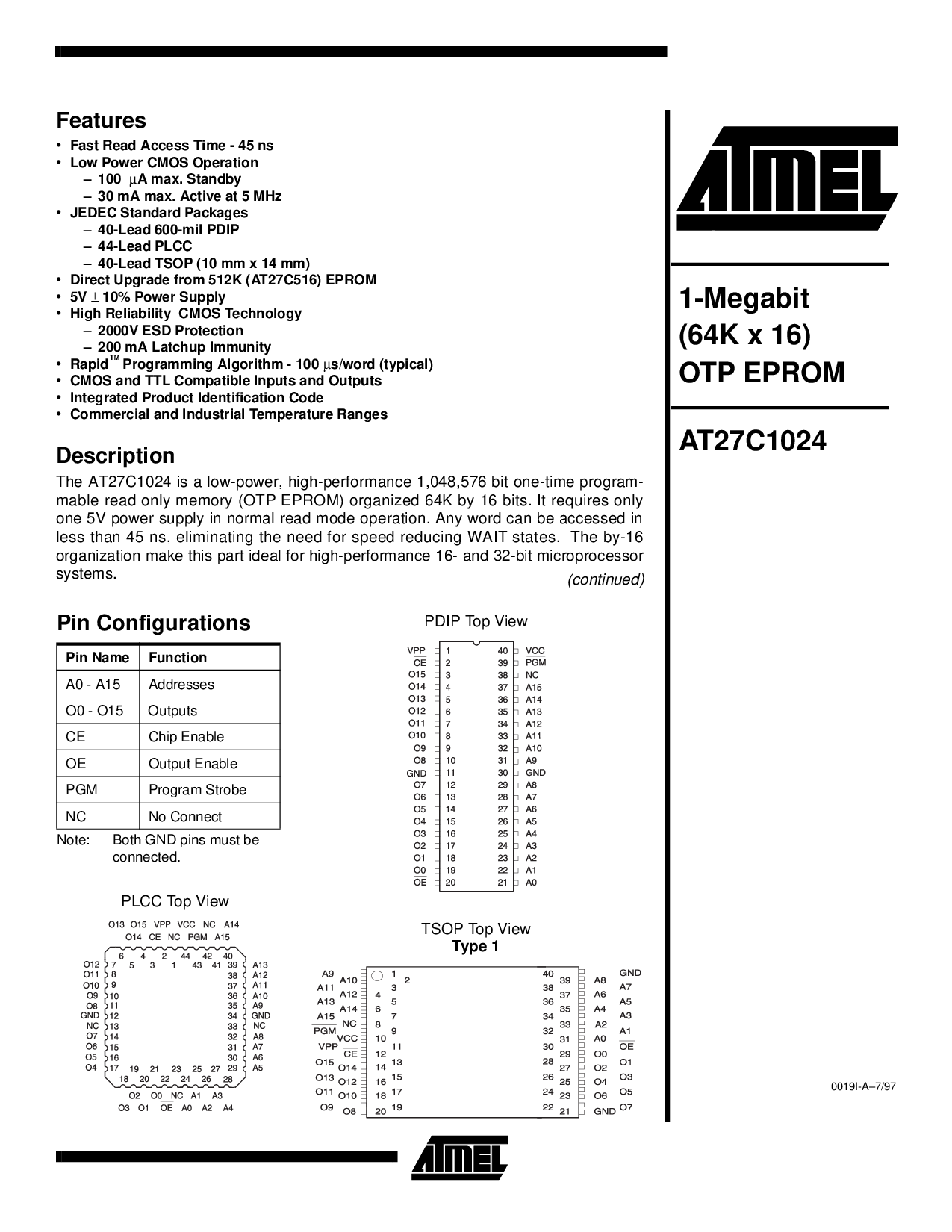这 at27c1024 是 一个 低-电源, 高性能 1,048,576 有点 一次性 程序-