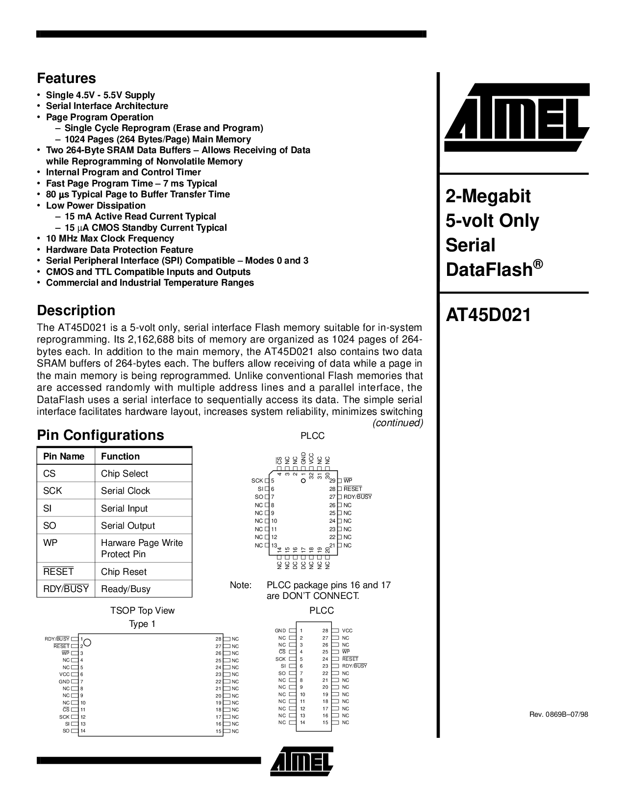 这 at45d021 是 一个 5-电压 仅, 串行 接口 闪光灯 记忆 适合 用于 在系统内