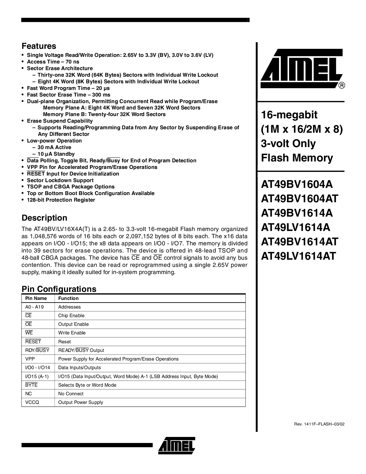 这 at49bv/lv16x4a(t) 是 一个 2.65- 至 3.3-电压 16-兆位 闪光灯 记忆 有组织的