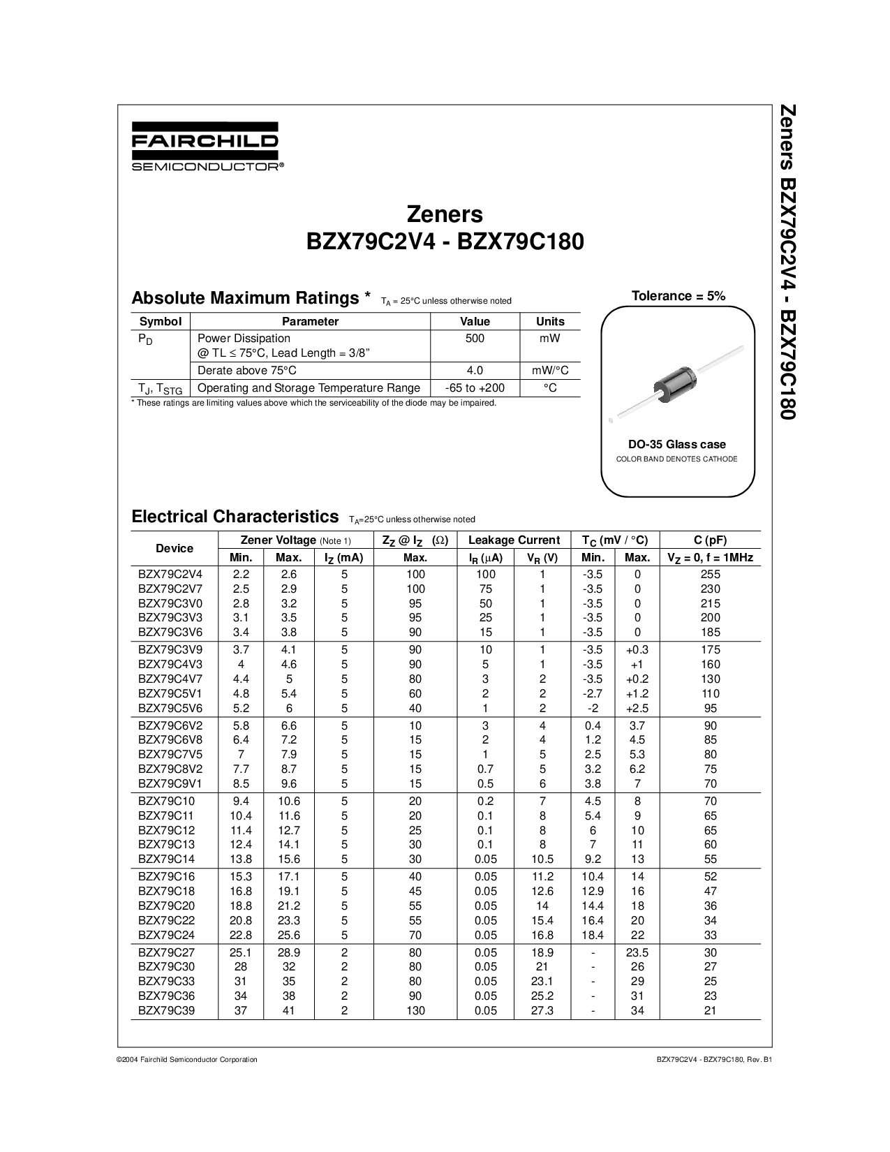 ©2004 仙童 半导体 公司 bzx79c2v4 - bzx79c180, rev. b1