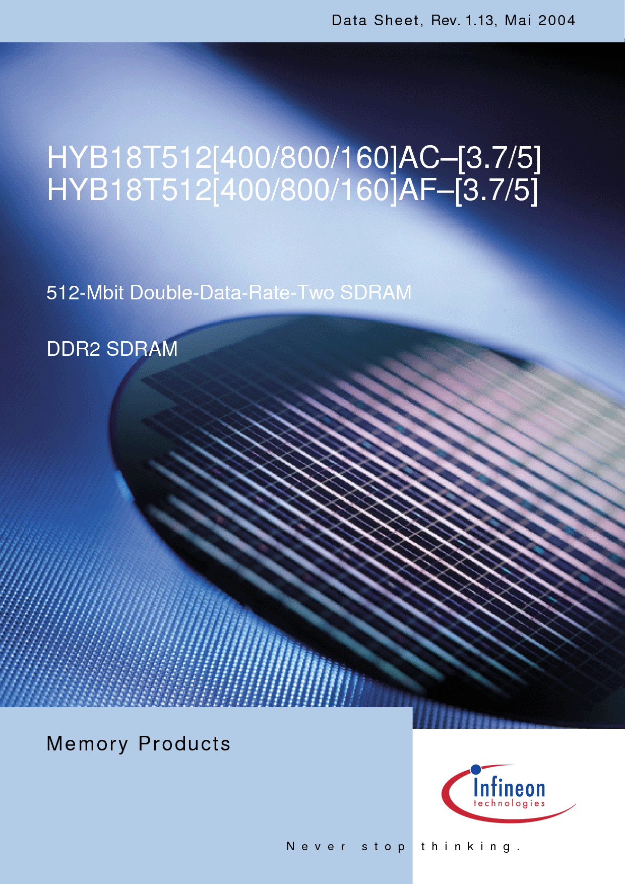 从不 停止 思考. hyb18t512[400/800/160]ac–[3.7/5] hyb18t512[400/800/160]af–[3.7/5] 512-mbit 双-数据-费率-两个 SDRAM ddr2 sdram 数据 工作表, rev. 1.13, mai 2004 记忆 产品 | |