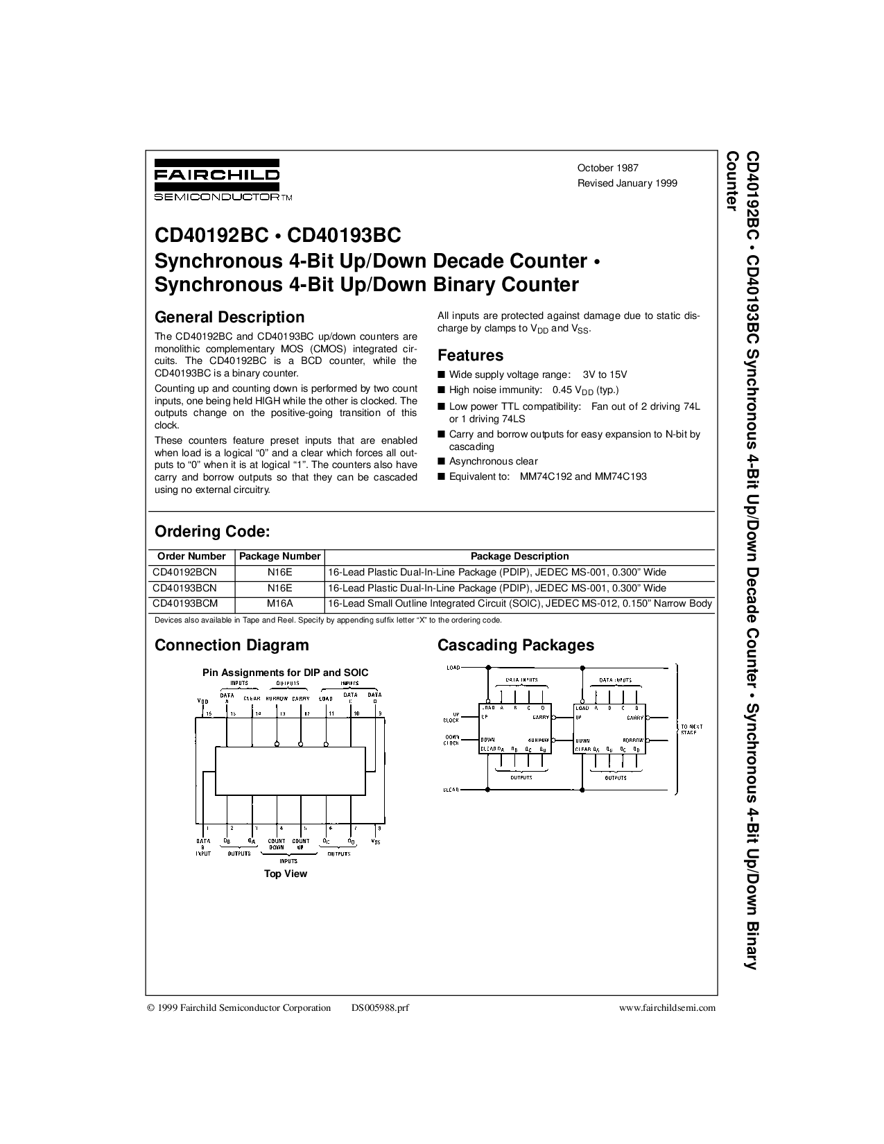 • cd40193bc 同步 4-有点 向上/向下 十年 计数器 • 同步 4-有点 向上/向下 二进制