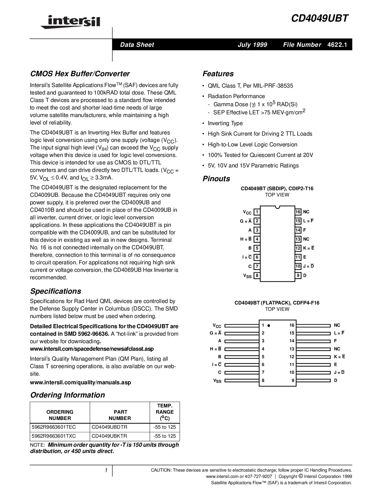 5962R9663601TEC CD4049UBDTR -55 至 125
