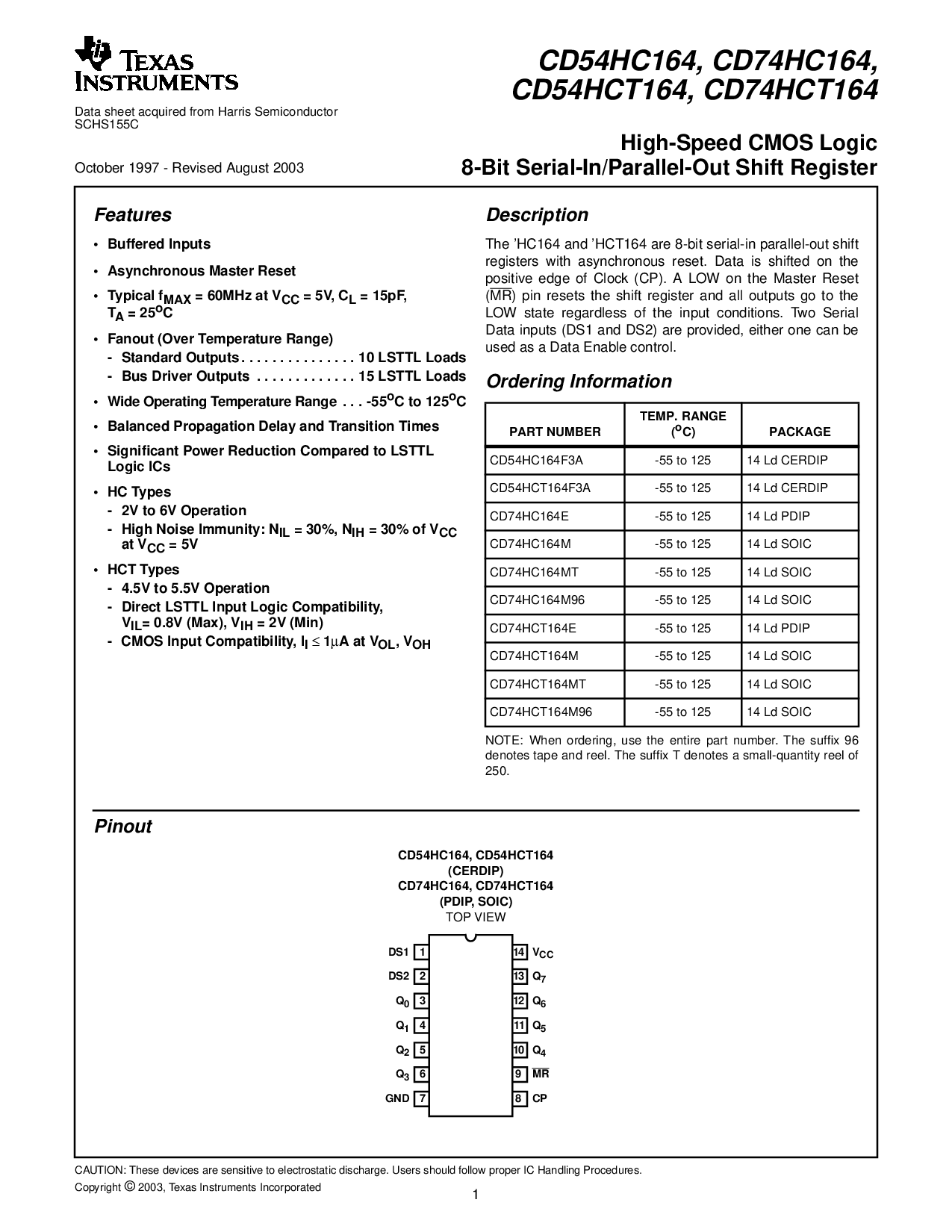 CD54HC164F3A -55 至 125 14 ld cerdip